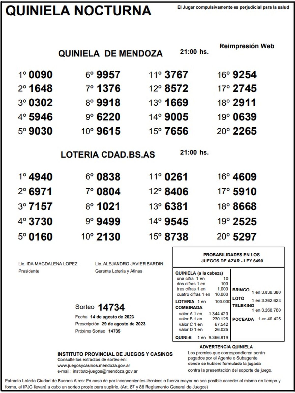 Quiniela de Mendoza: resultados de la Nocturna de hoy, 14 de agosto de 2023