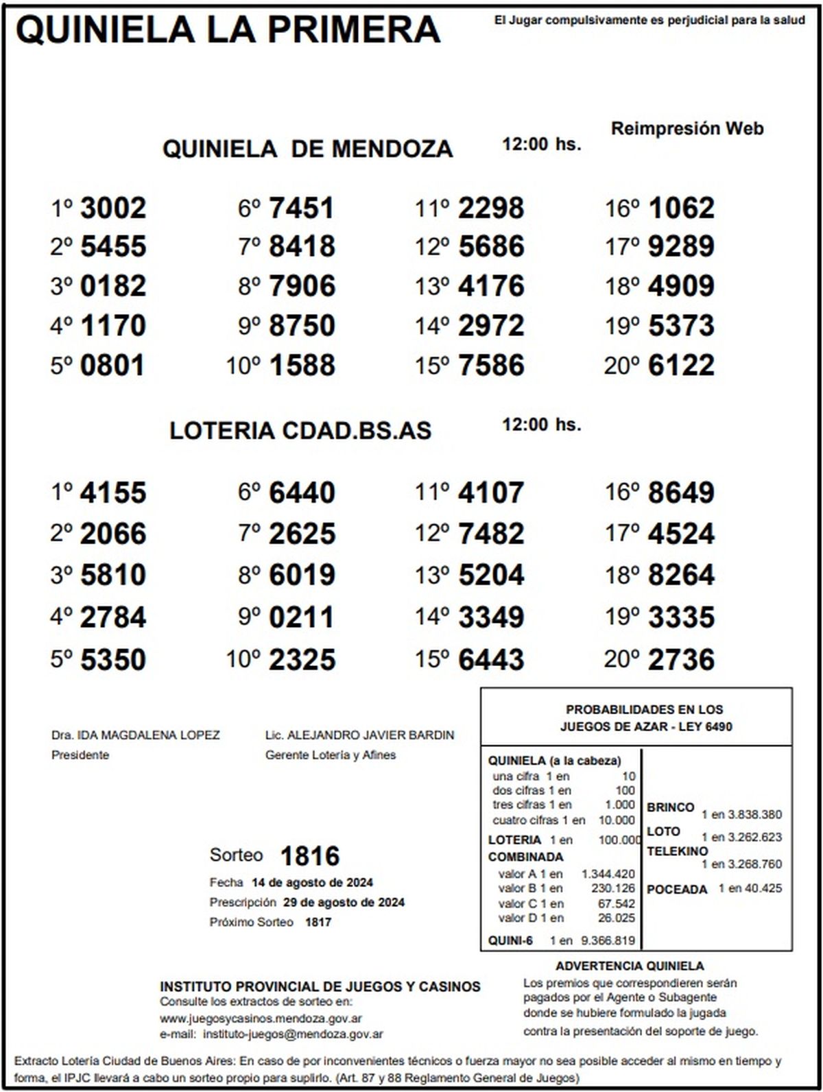 Resultados Quiniela de Mendoza: La Primera del 14 de agosto 2024