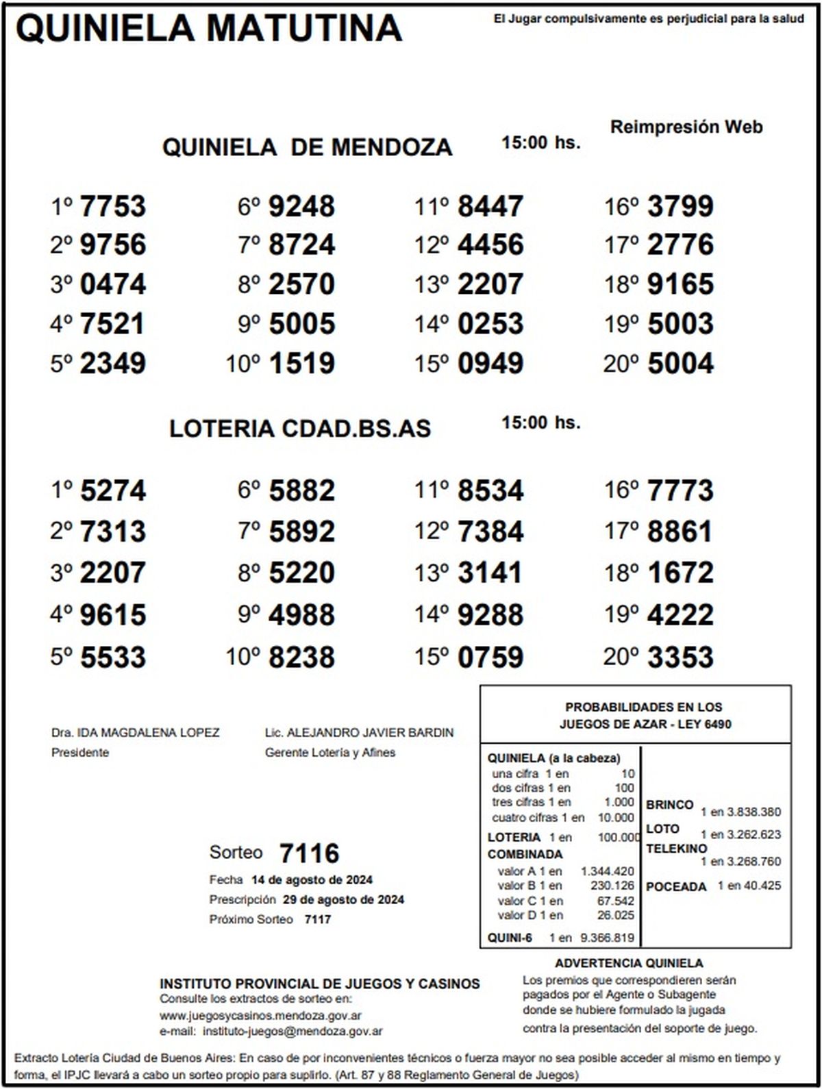 Resultados Quiniela de Mendoza: La Matutina del 14 de agosto 2024