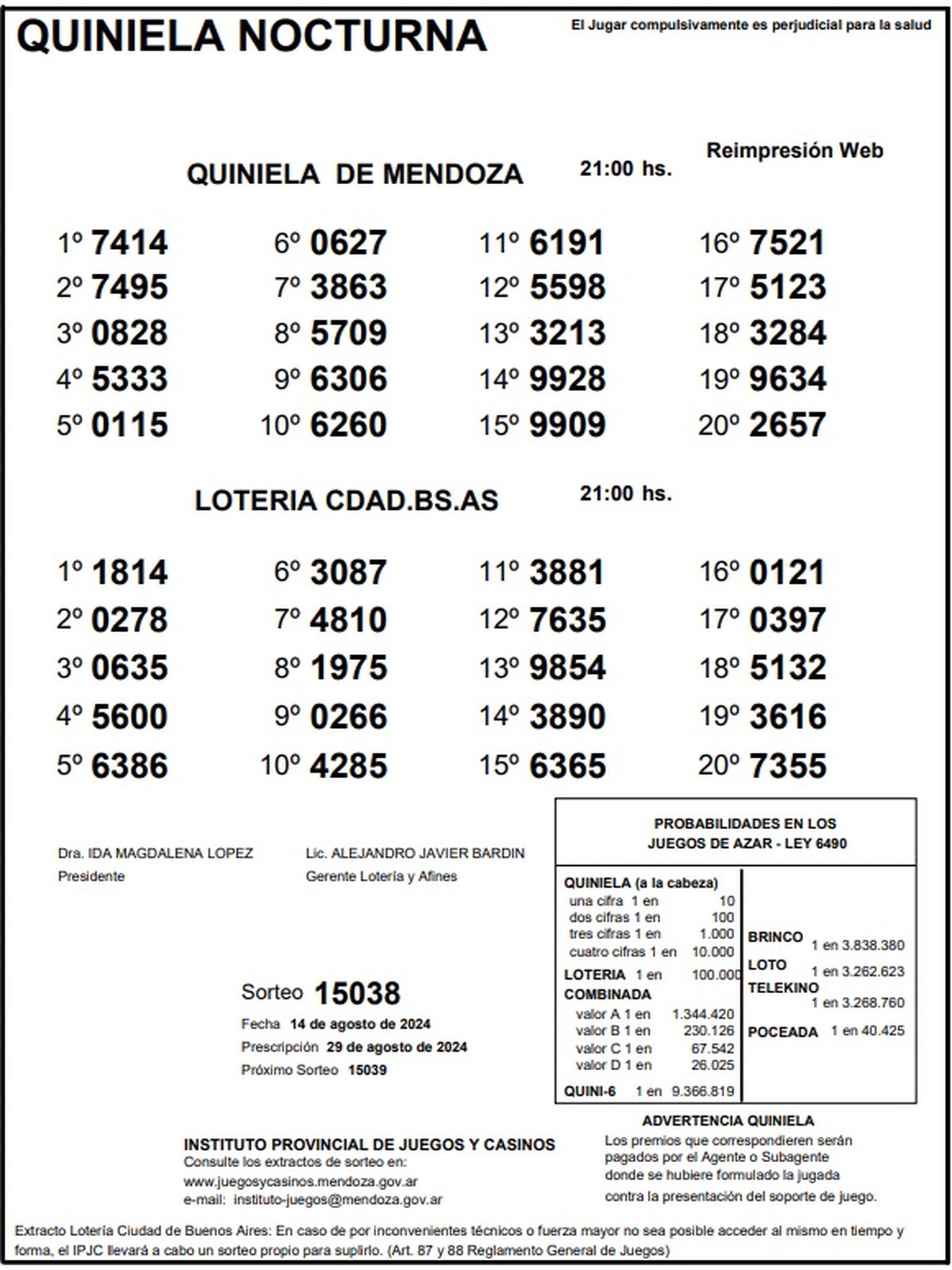 Resultados Quiniela de Mendoza: La Vespertina del 14 de agosto 2024
