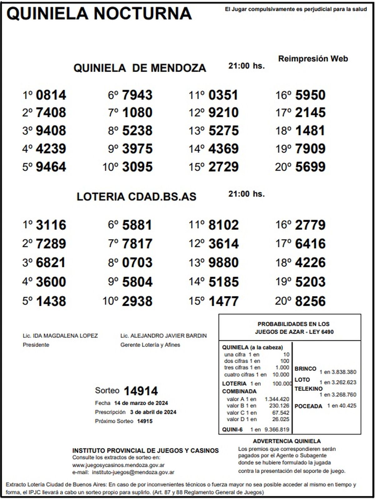 Quiniela de Mendoza: resultados de la Nocturna de hoy, 14 de marzo de 2024