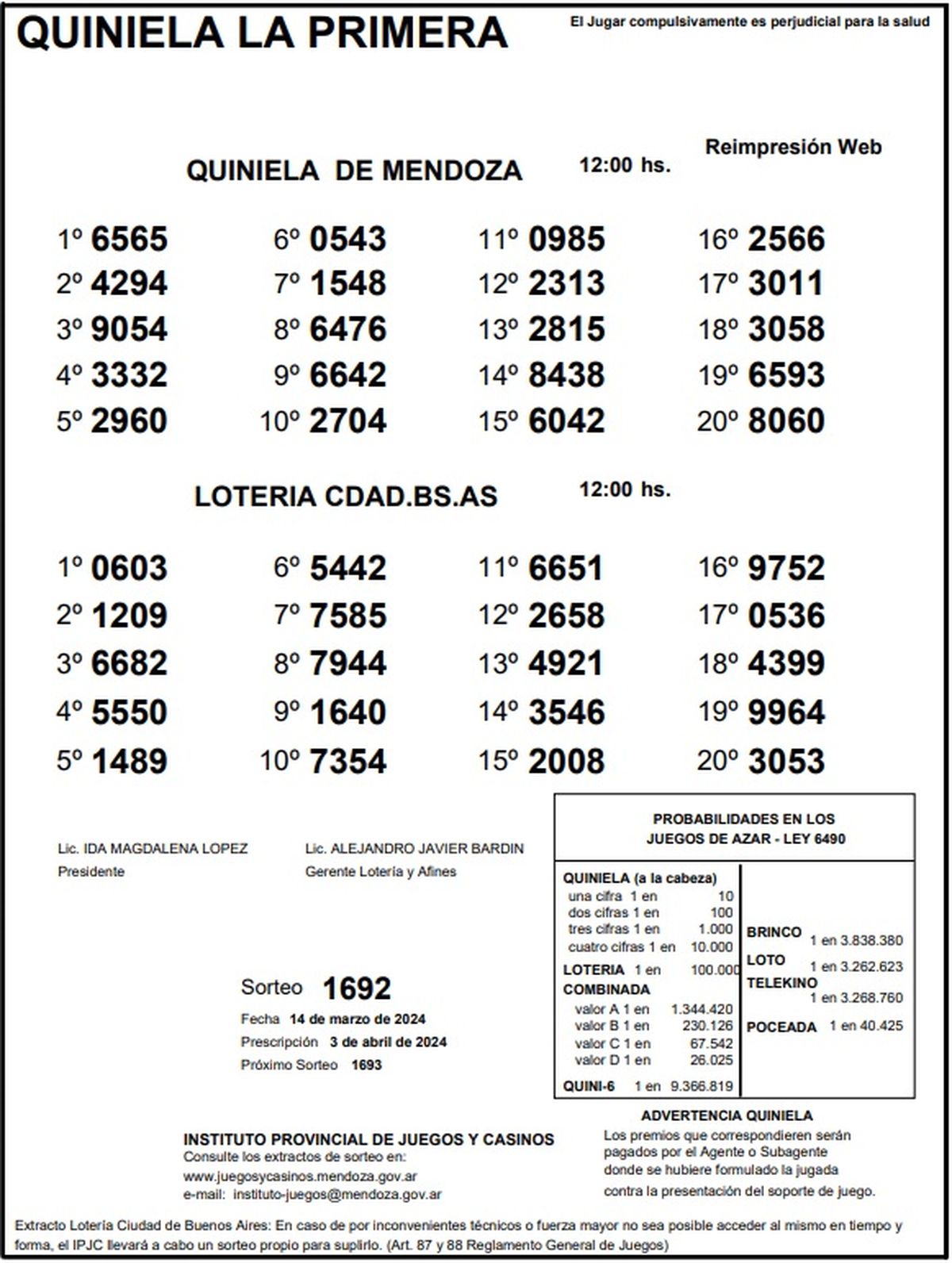 Resultados Quiniela de Mendoza: La Primera del 14 de marzo 2024