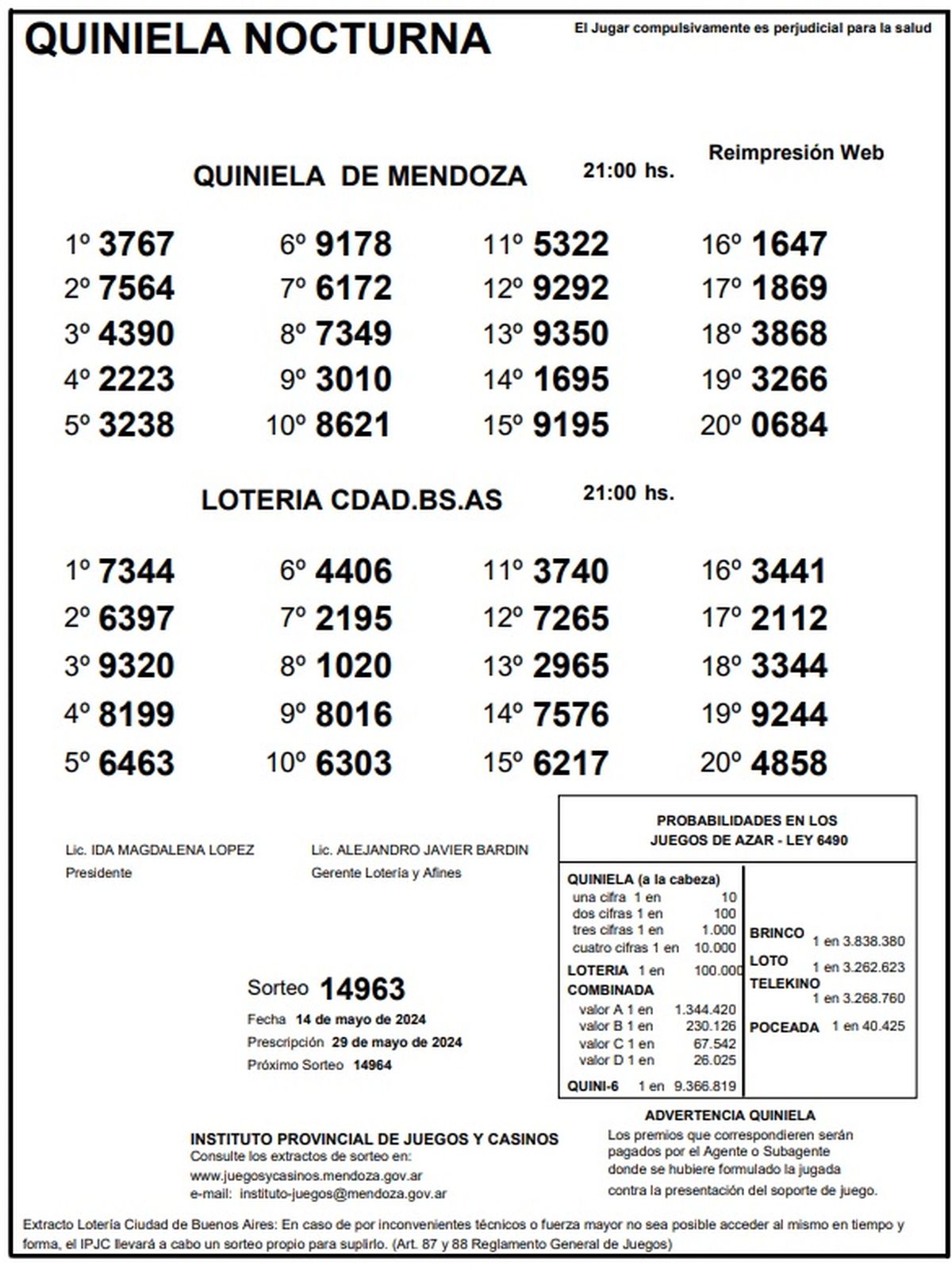 Quiniela de Mendoza: resultados de la Nocturna de hoy, 14 de mayo