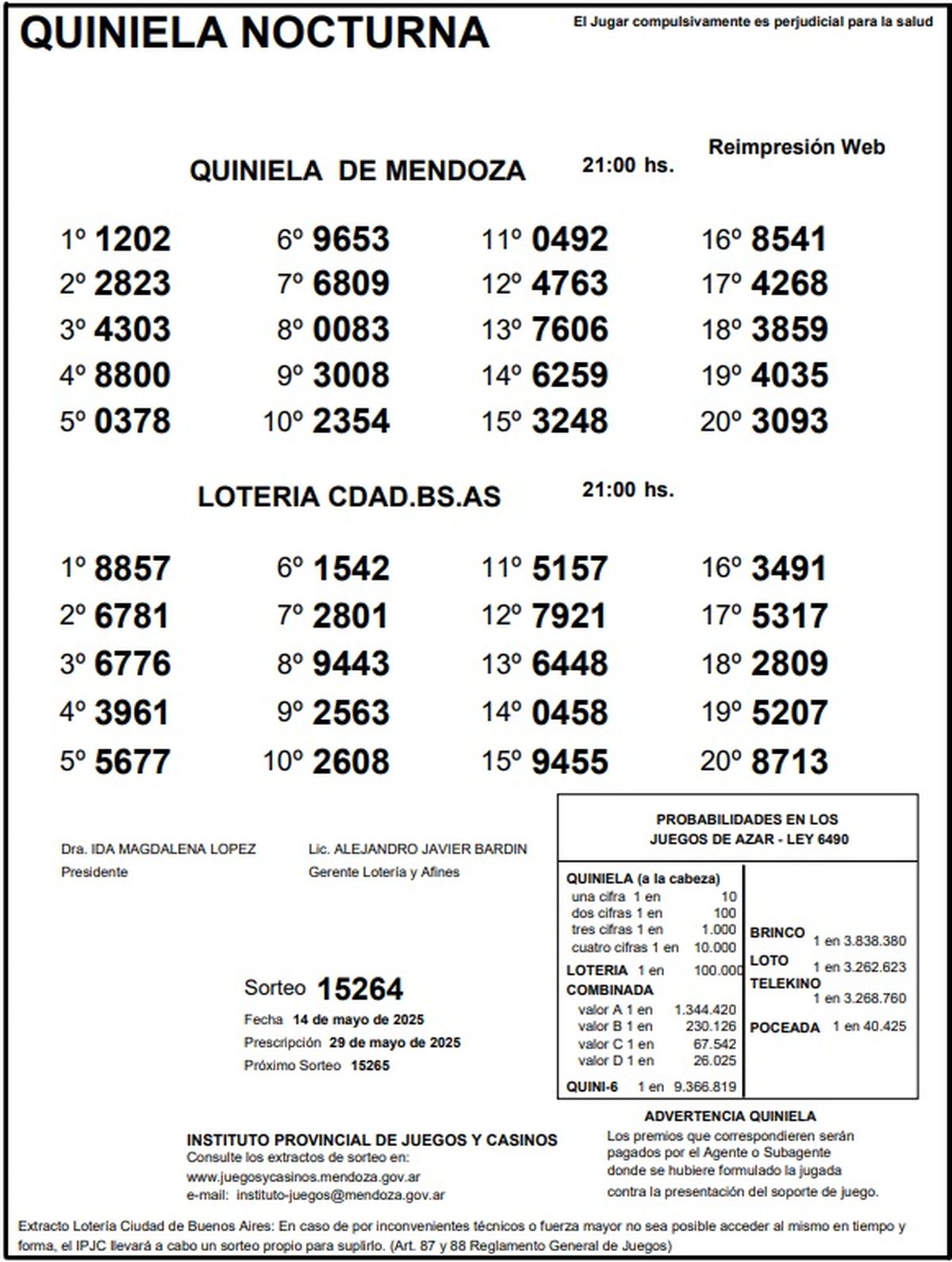 Quiniela de Mendoza: resultados de la Nocturna de hoy, 14 de mayo de 2025