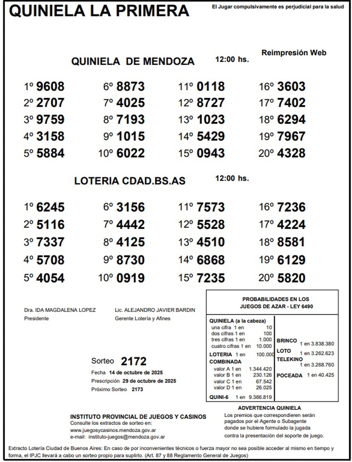 Resultados Quiniela de Mendoza: La Primera del 14 de octubre de 2025