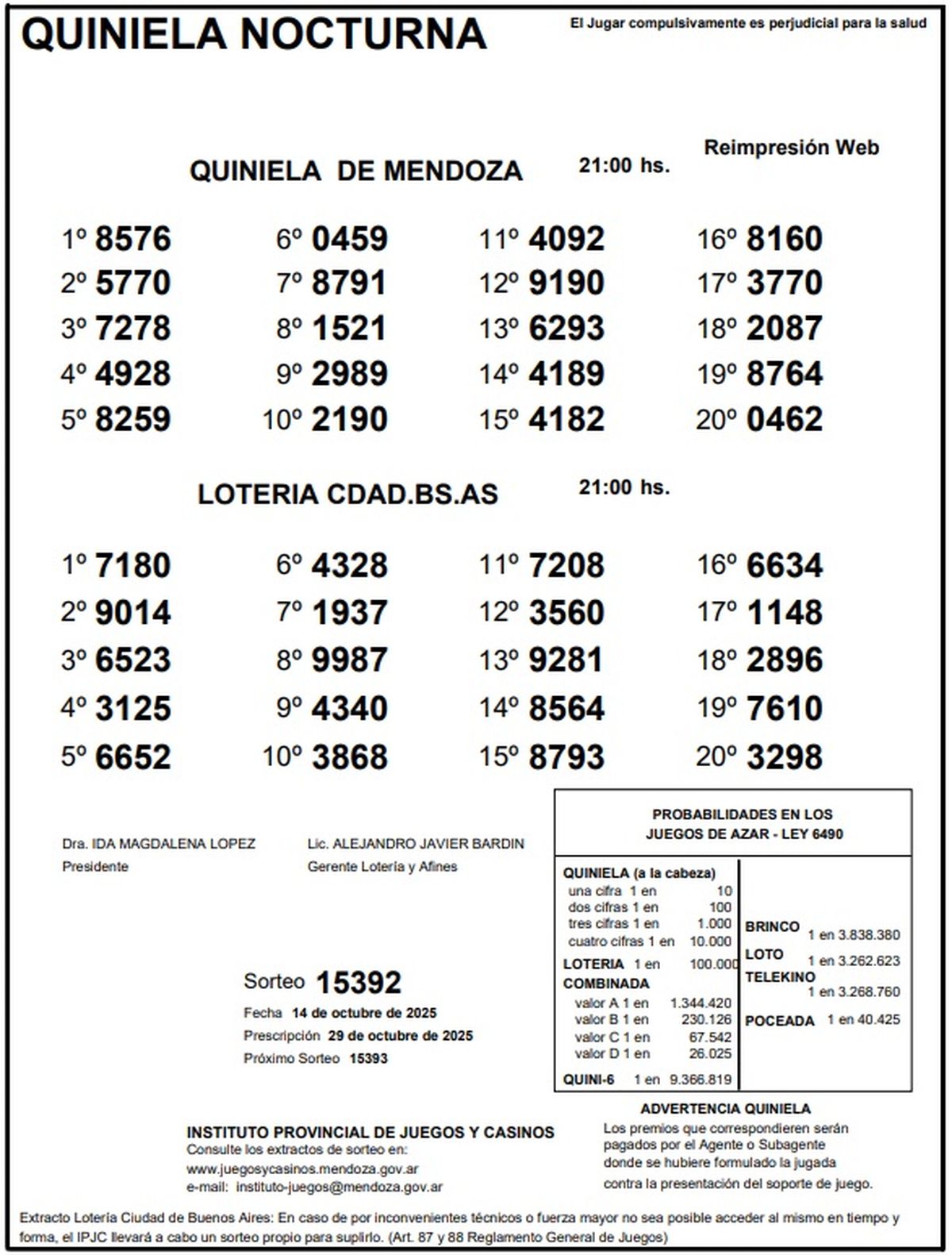 Quiniela de Mendoza: resultados de la Nocturna de hoy, 14 de octubre.