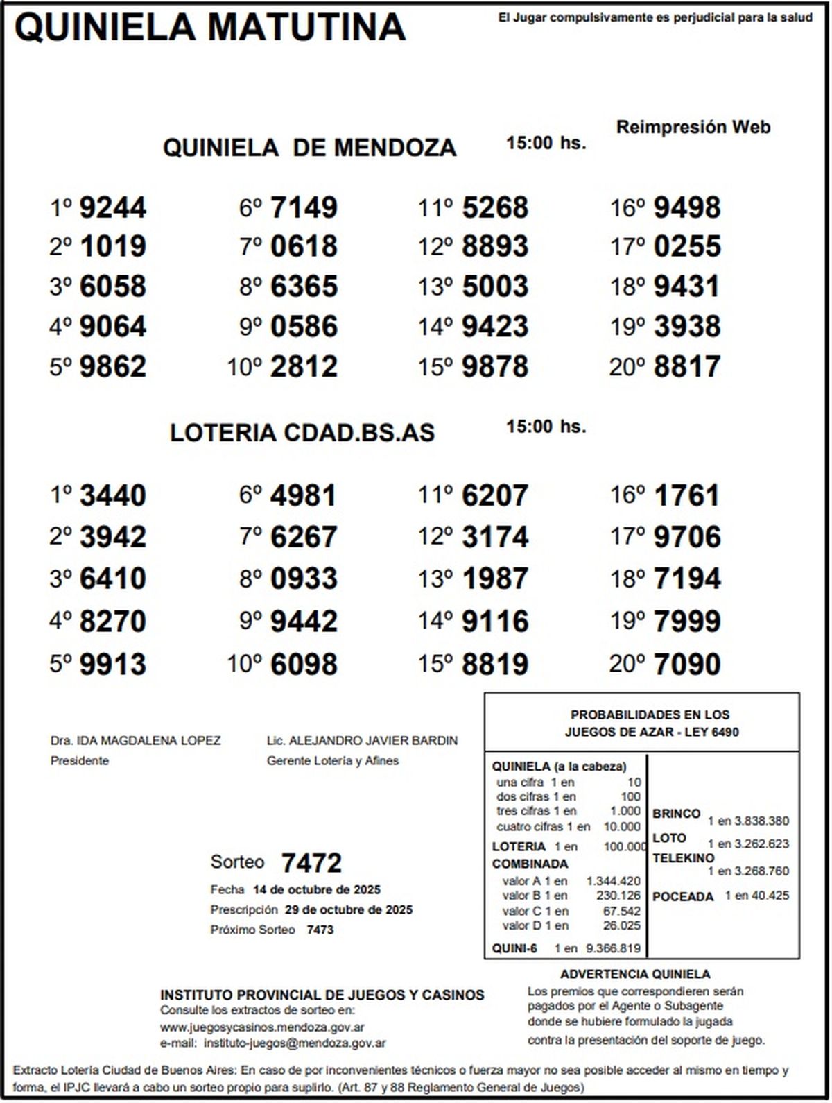 Resultados Quiniela de Mendoza: La Matutina del 14 de octubre de 2025