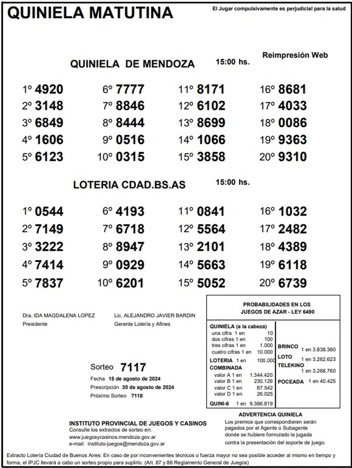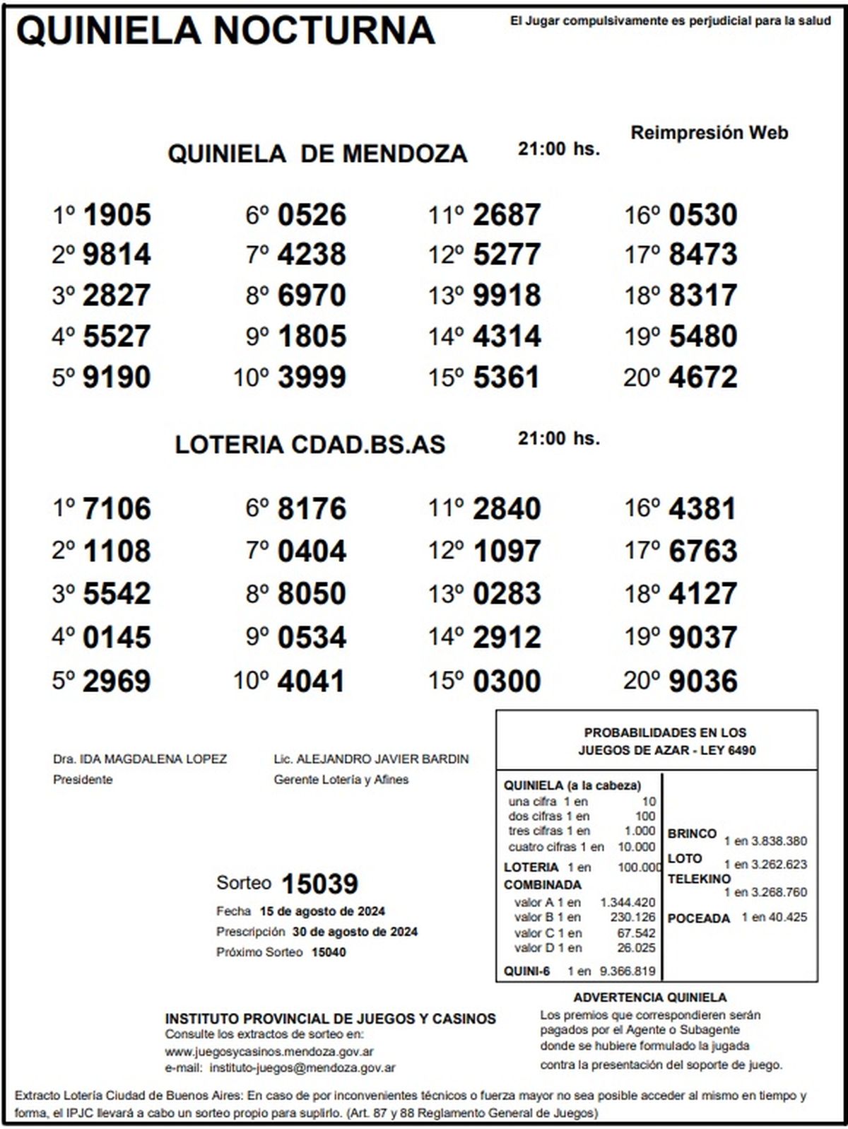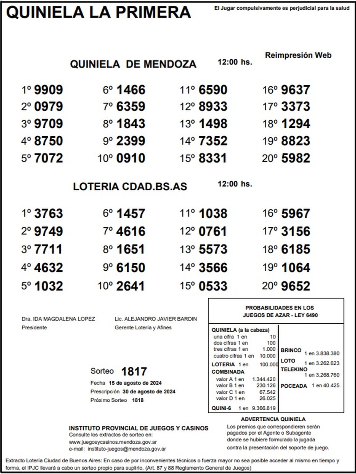 Resultados Quiniela de Mendoza: La Primera del 15 de agosto 2024