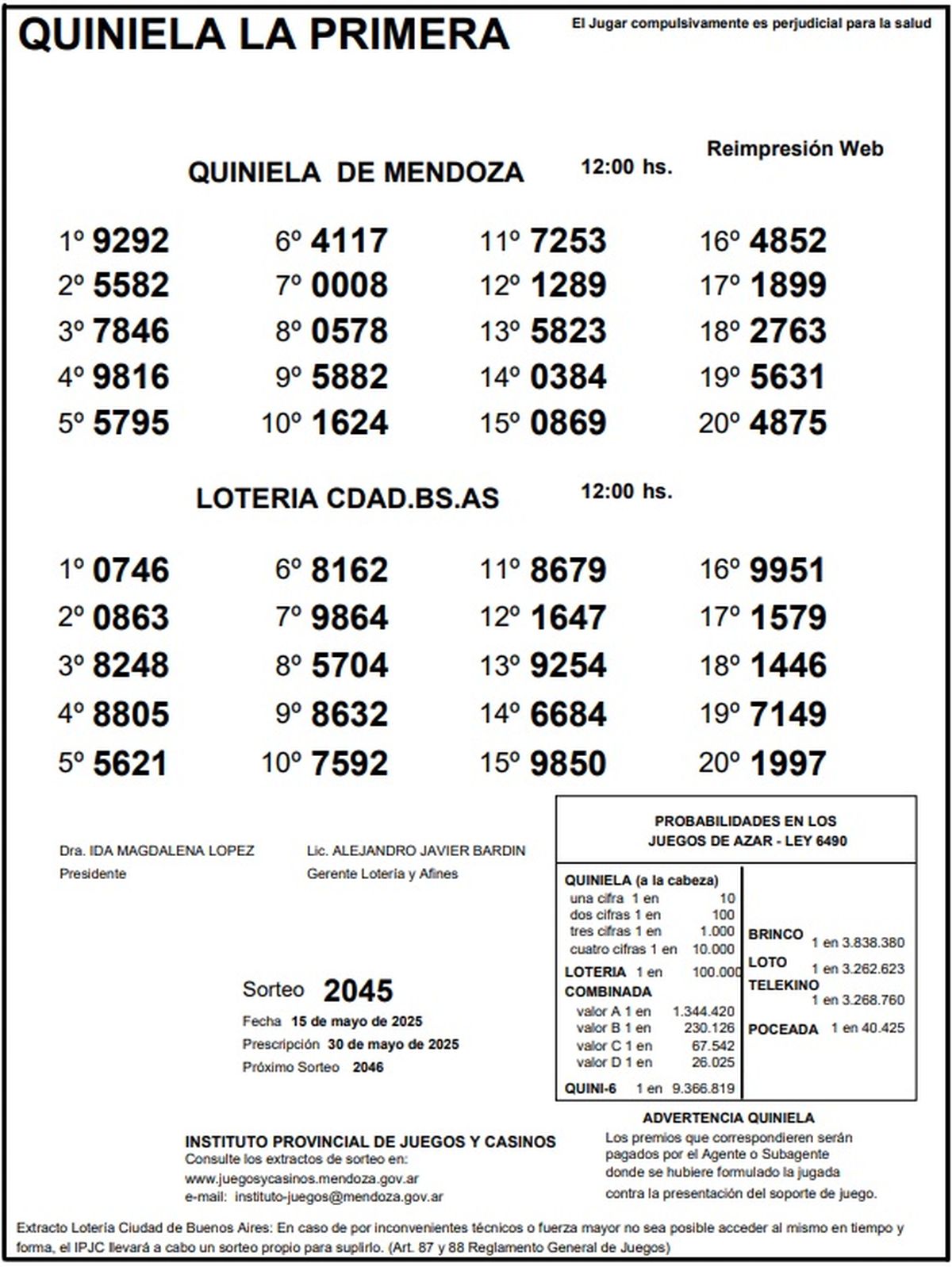 Resultados Quiniela de Mendoza: La Primera del 15 de mayo de 2025