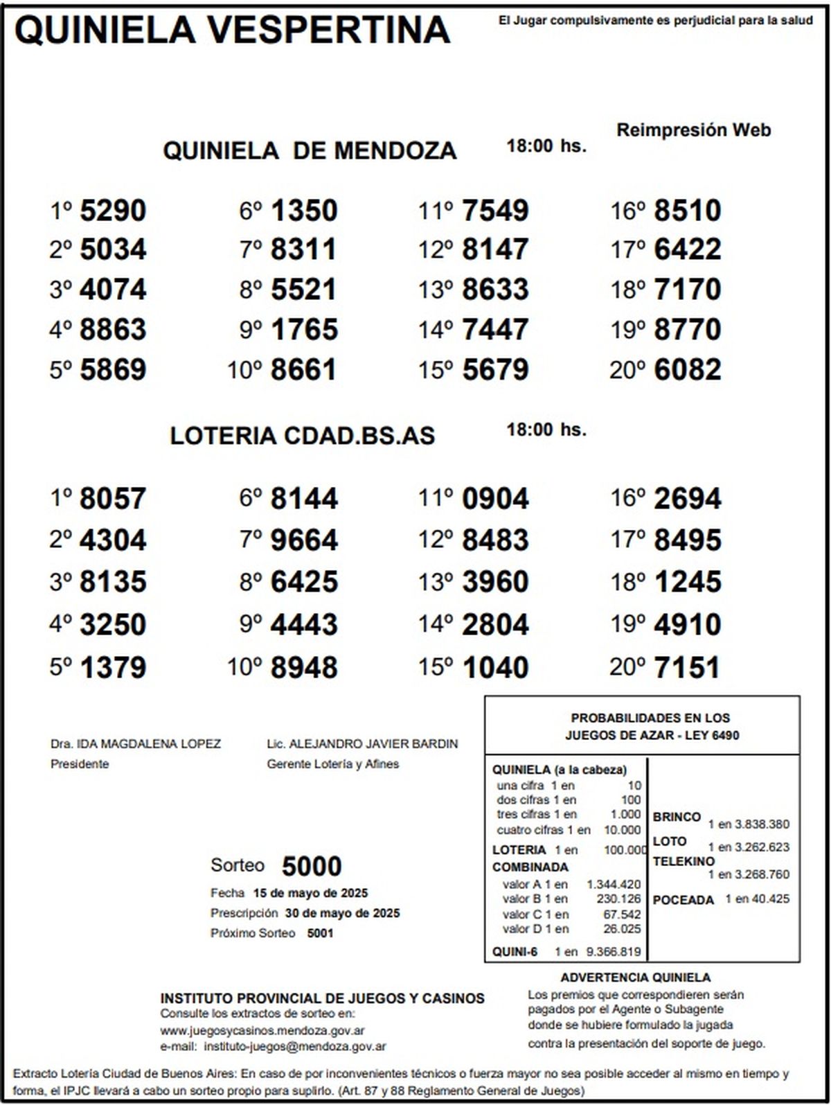 Resultados Quiniela de Mendoza: La Vespertina del 15 de mayo de 2025