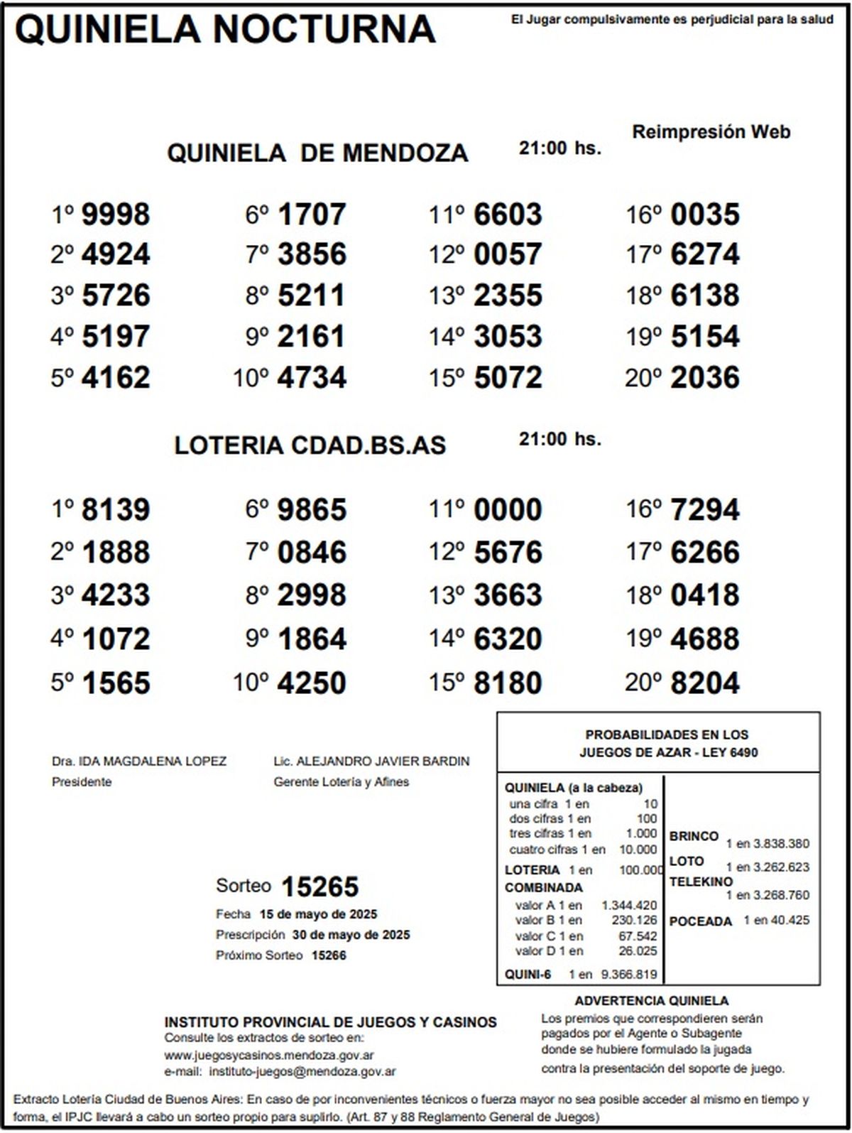 Quiniela de Mendoza: resultados de la Nocturna de hoy, 15 de mayo de 2025