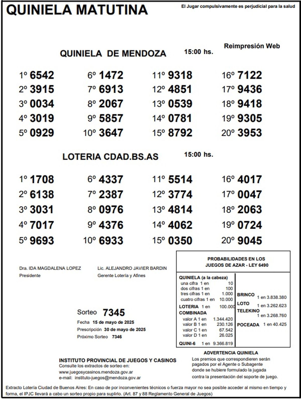 Resultados Quiniela de Mendoza: La Matutina del 15 de mayo de 2025