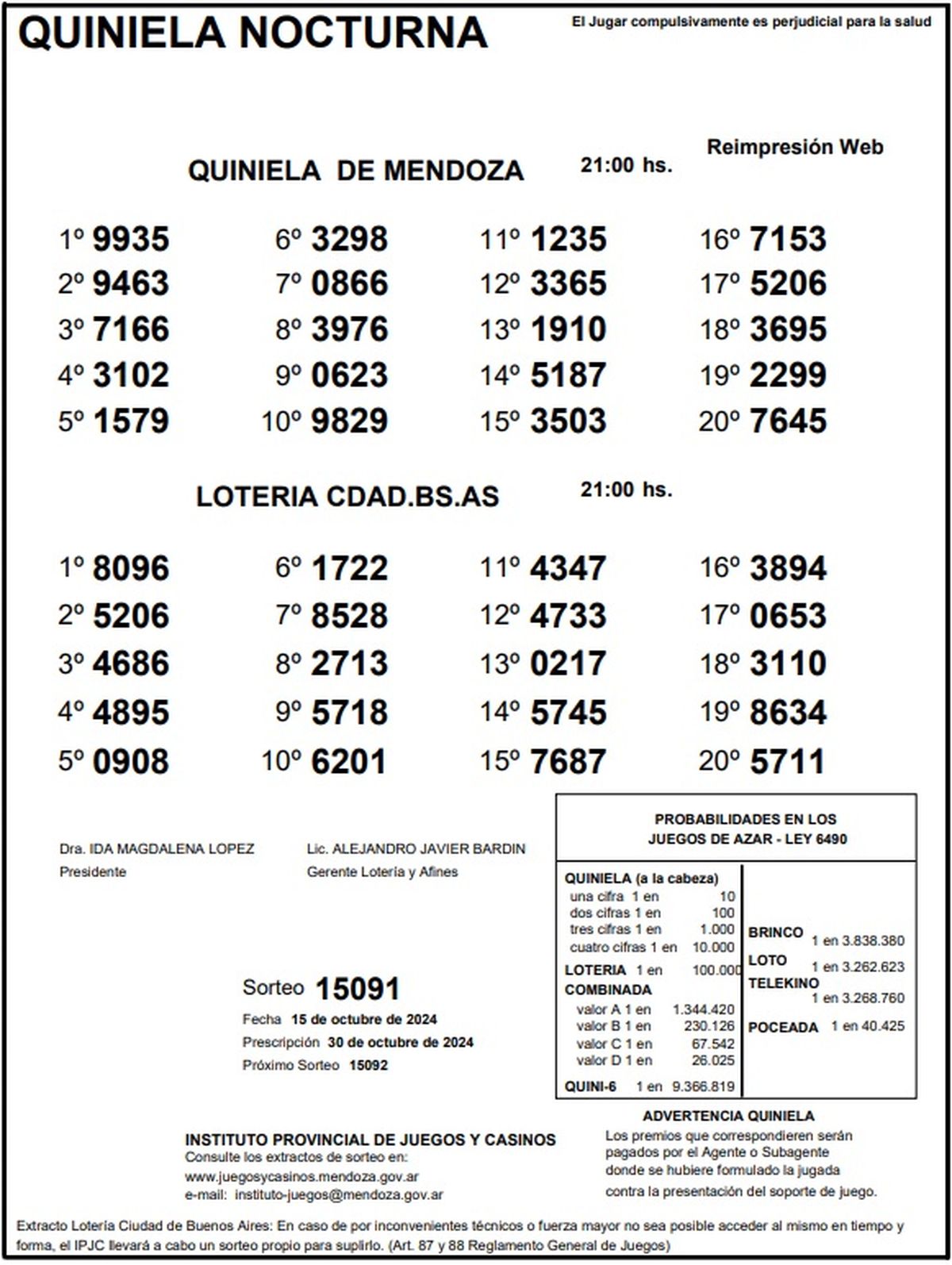 Quiniela de Mendoza: resultados de la Nocturna de hoy, 15 de octubre