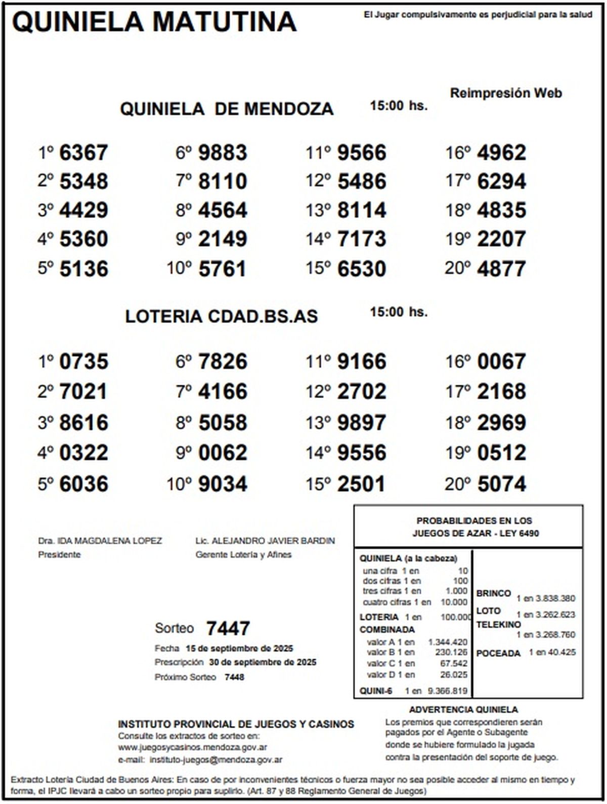 Resultados Quiniela de Mendoza: La Matutina del 15 de septiembre de 2025