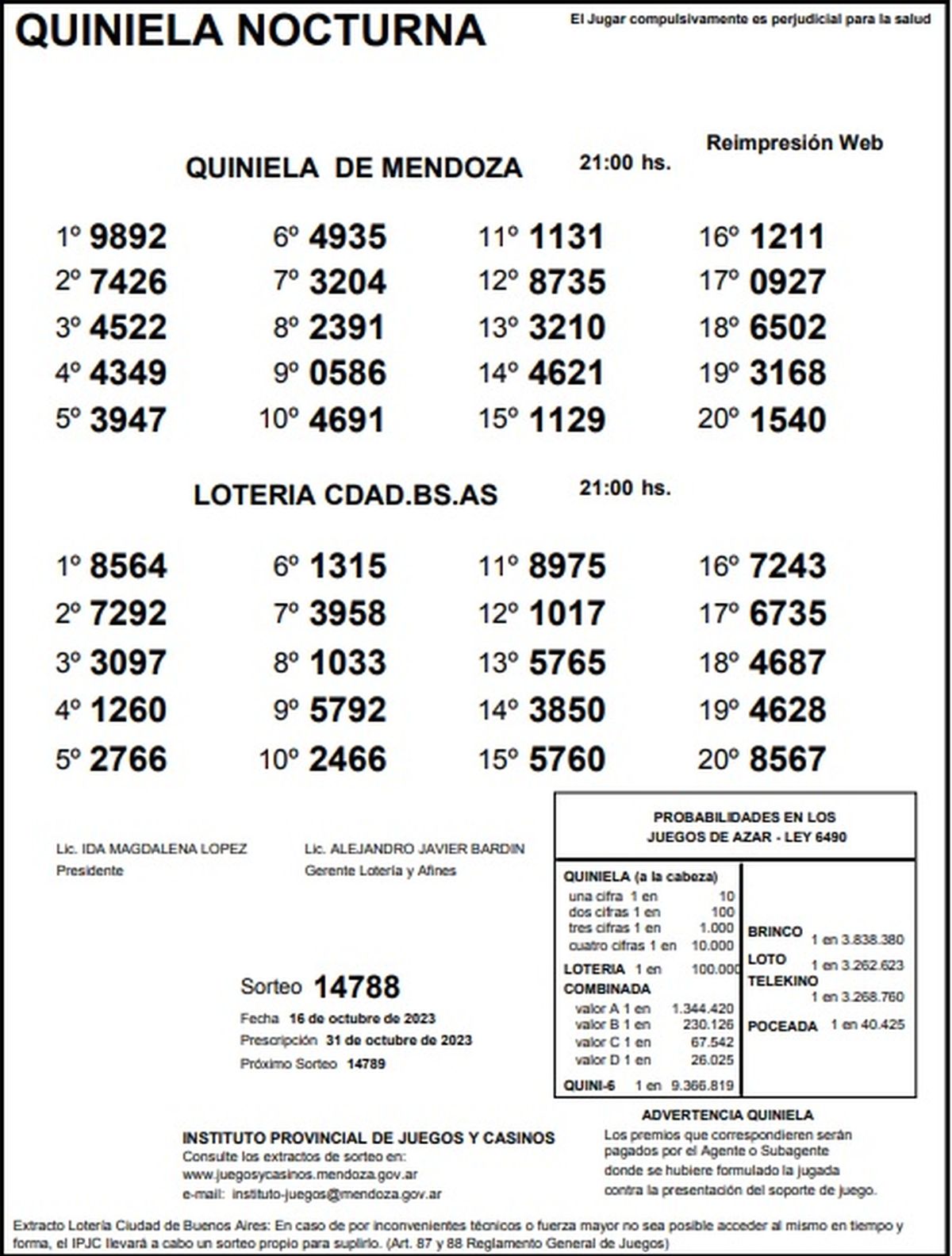 Quiniela de Mendoza: resultados de la Nocturna de hoy, 16 de octubre de 2023