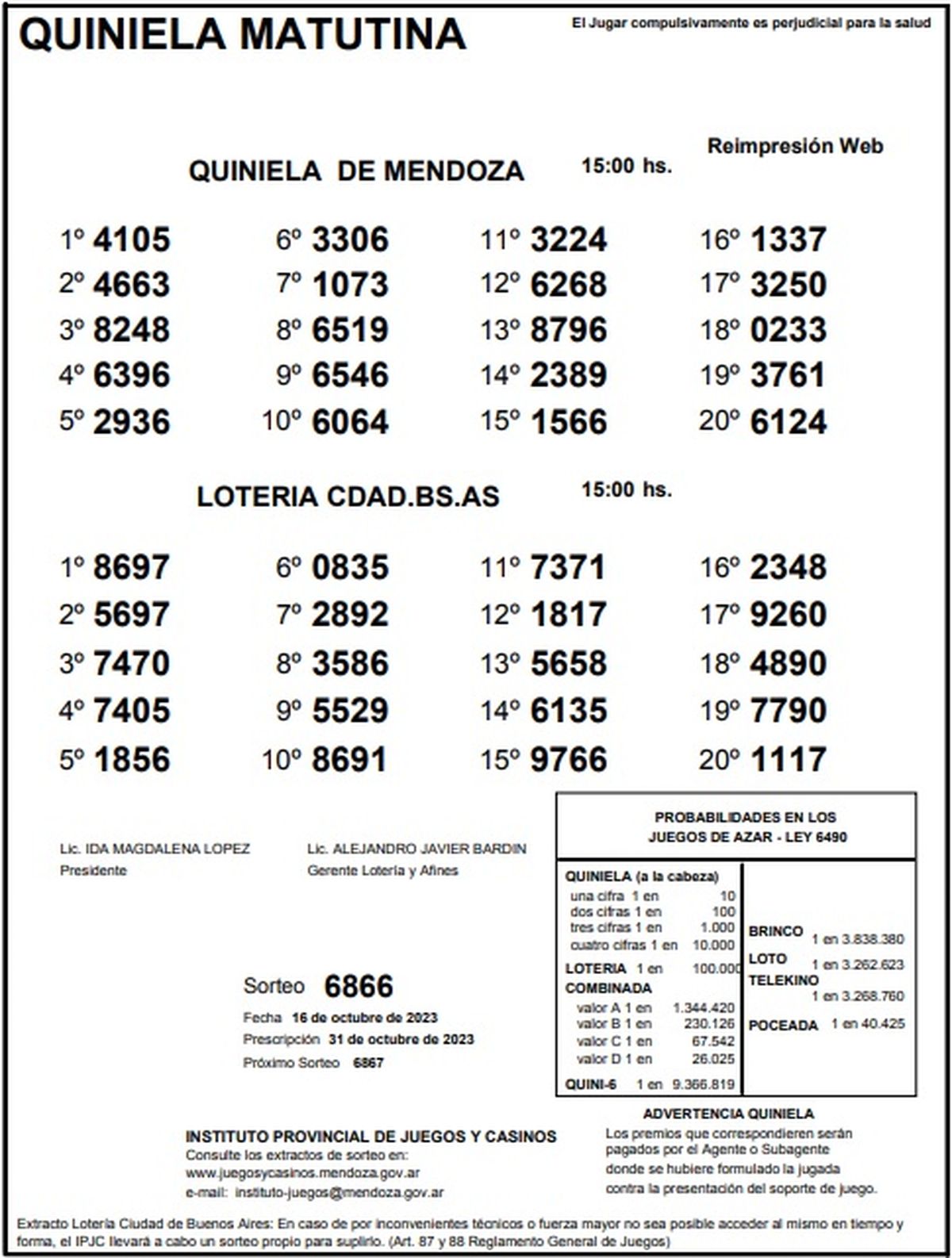 Resultados Quiniela de Mendoza: La Matutina del 16 de octubre 2023