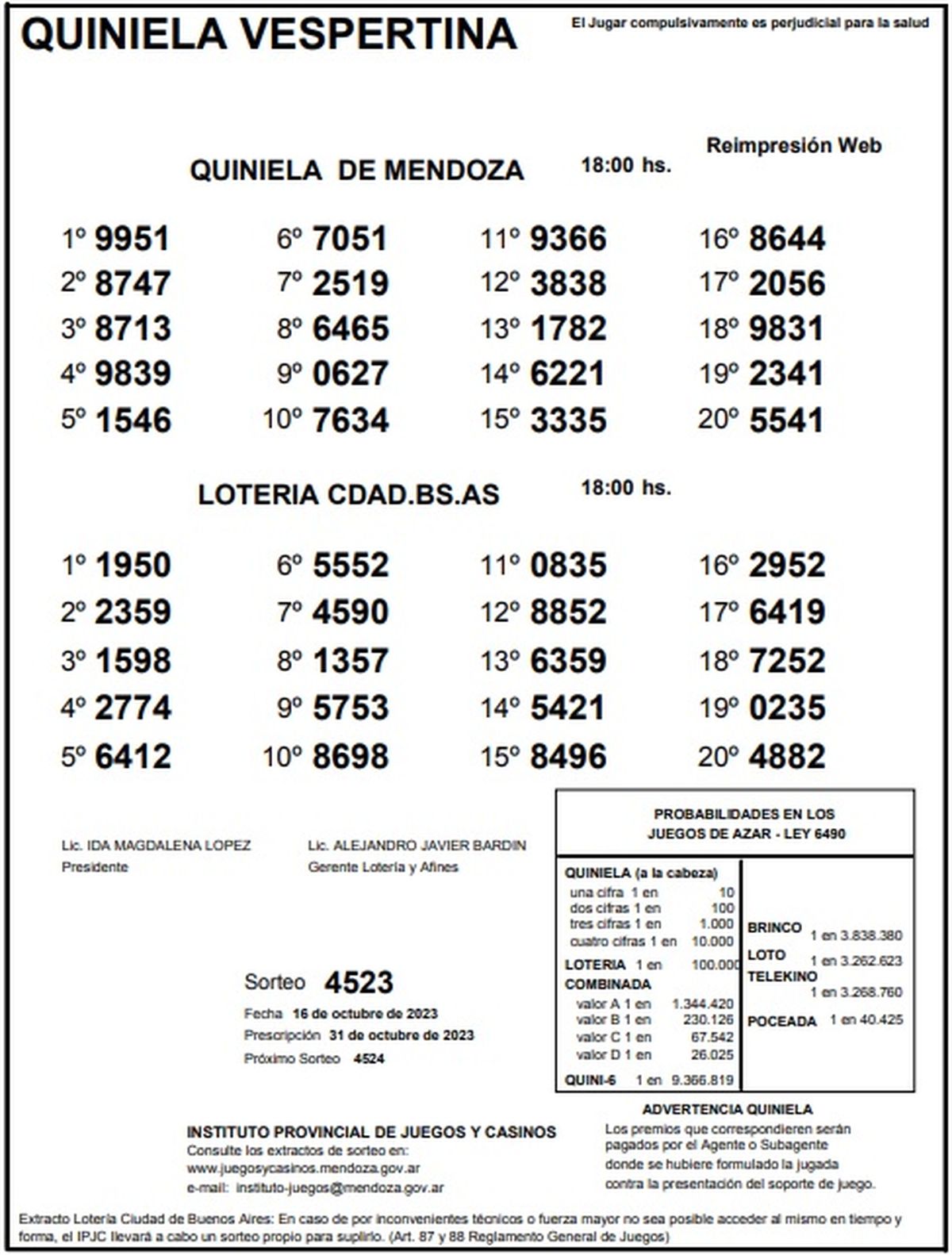 Resultados Quiniela de Mendoza: La Vespertina del 16 de octubre 2023