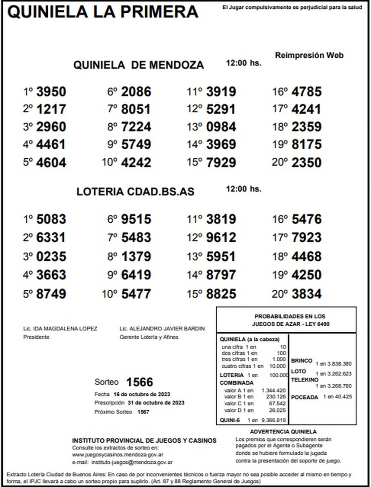 Resultados Quiniela de Mendoza: La Primera del 16 de octubre 2023