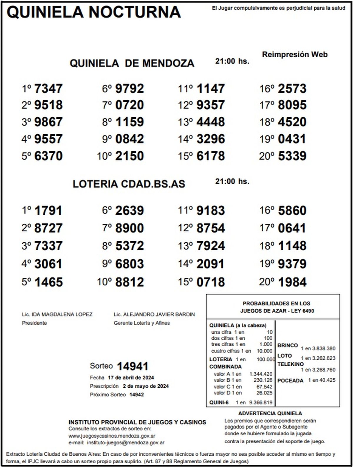Quiniela de Mendoza: resultados de la Nocturna de hoy, 17 de abril de 2024