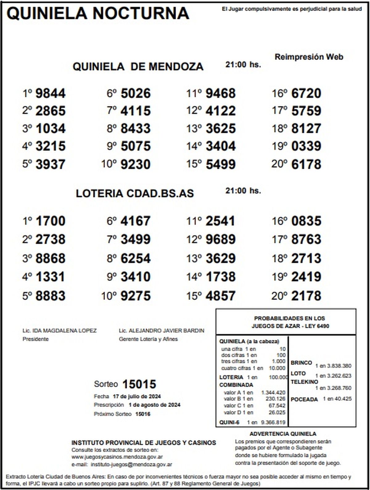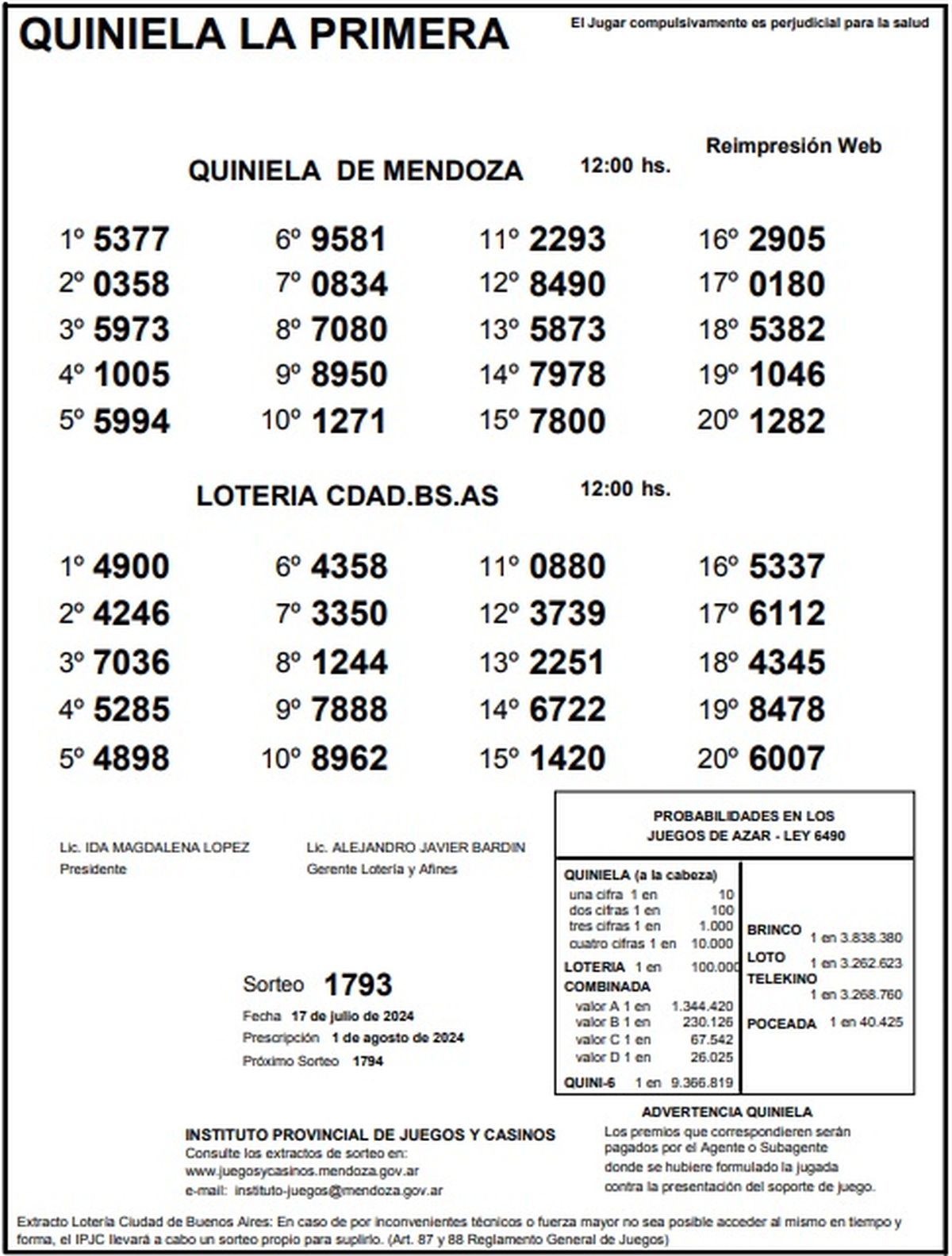 Resultados Quiniela de Mendoza: La Primera del 17 de julio 2024