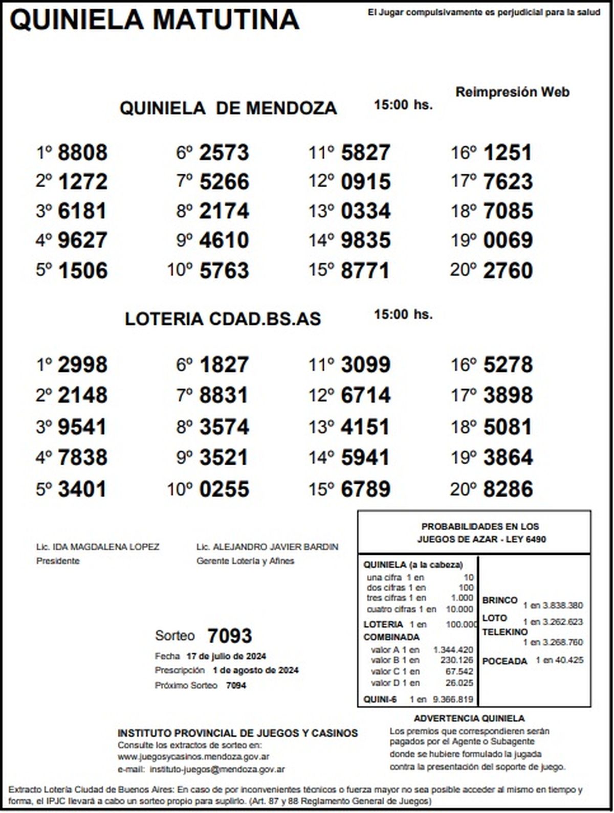 Resultados Quiniela de Mendoza: La Matutina del 17 de julio 2024