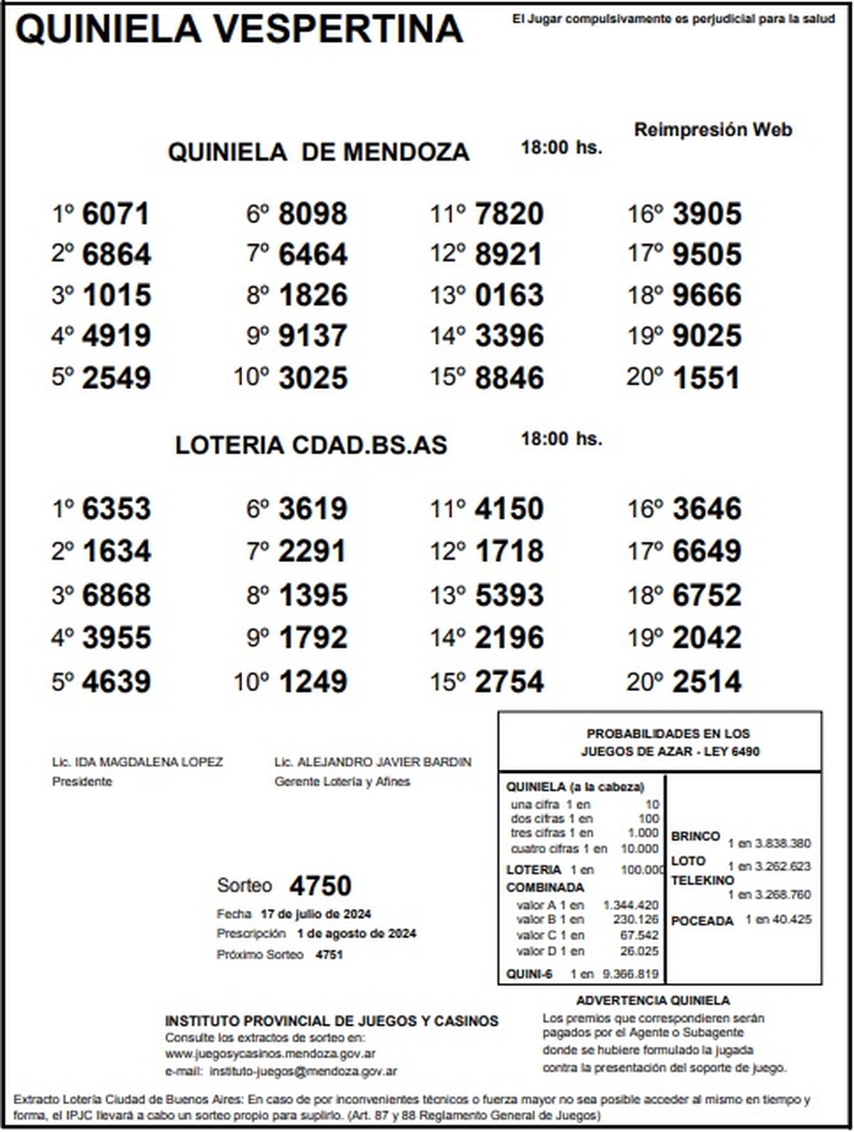 Resultados Quiniela de Mendoza: La Vespertina del 17 de julio 2024