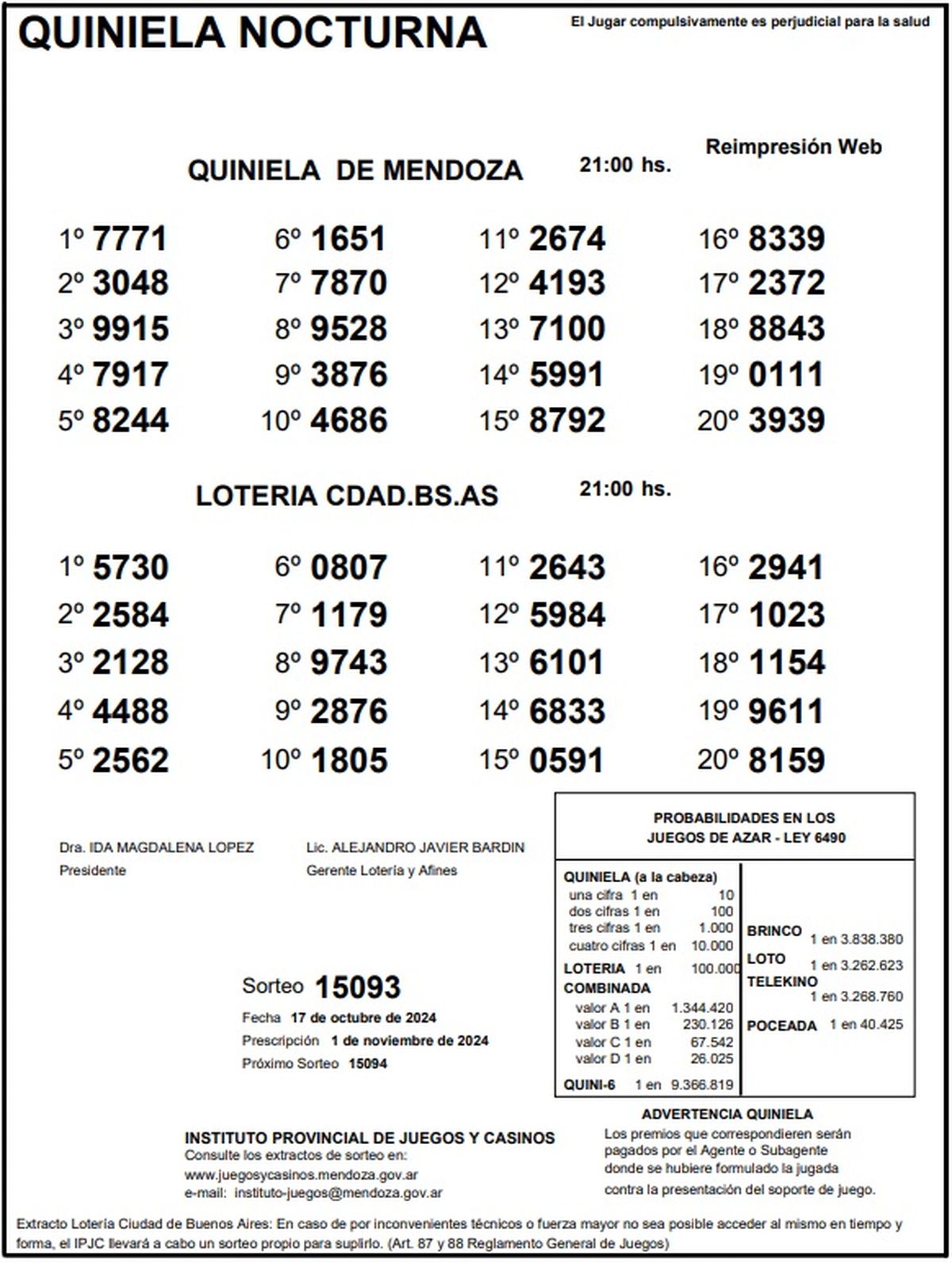 Quiniela de Mendoza: resultados de la Nocturna de hoy, 17 de octubre de 2024