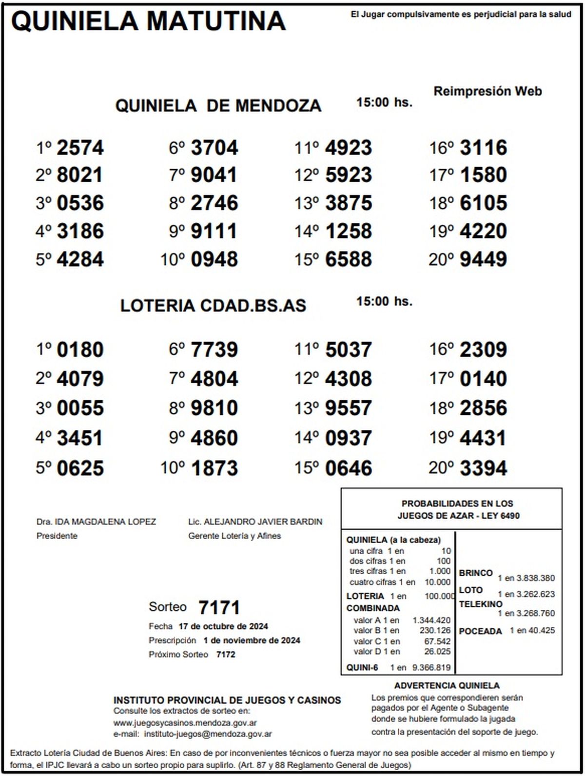 Resultados Quiniela de Mendoza: La Matutina del 17 de octubre 2024
