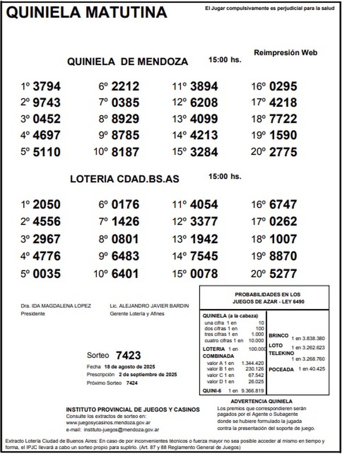 Resultados Quiniela de Mendoza: La Matutina del 18 de agosto de 2025