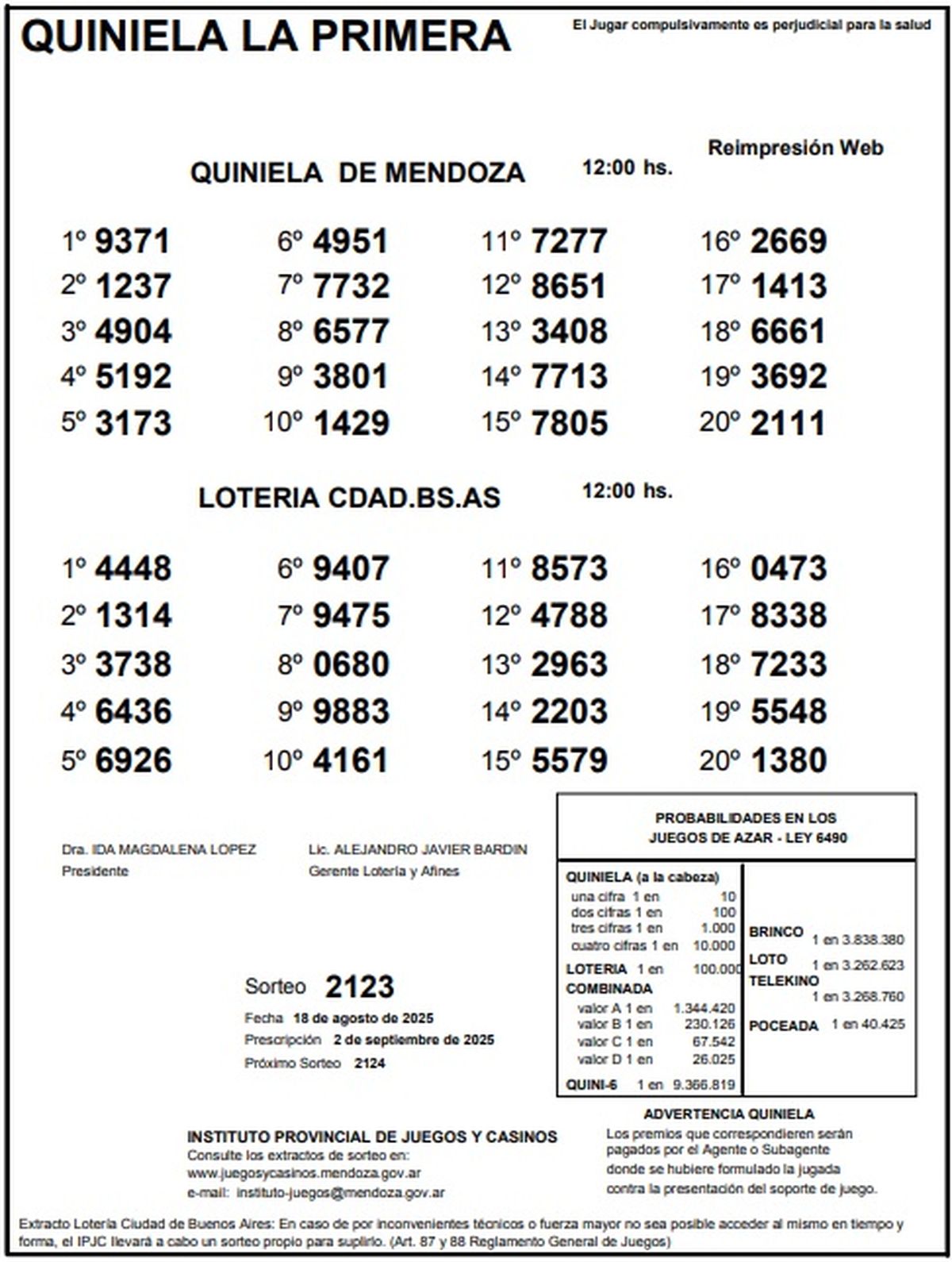 Resultados Quiniela de Mendoza: La Primera del 18 de agosto de 2025