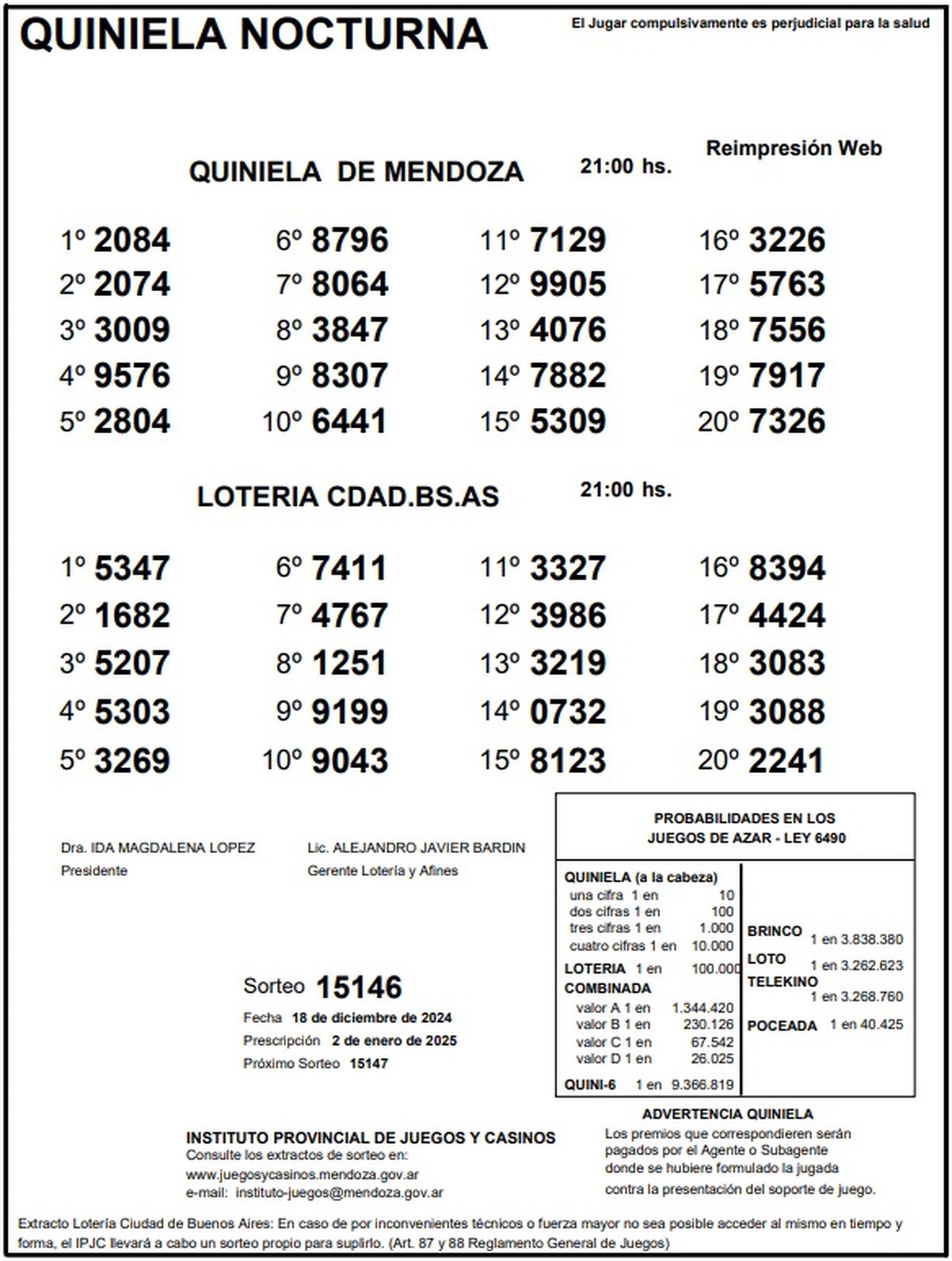 Quiniela de Mendoza: resultados de la Nocturna de hoy, 18 de diciembre de 2024