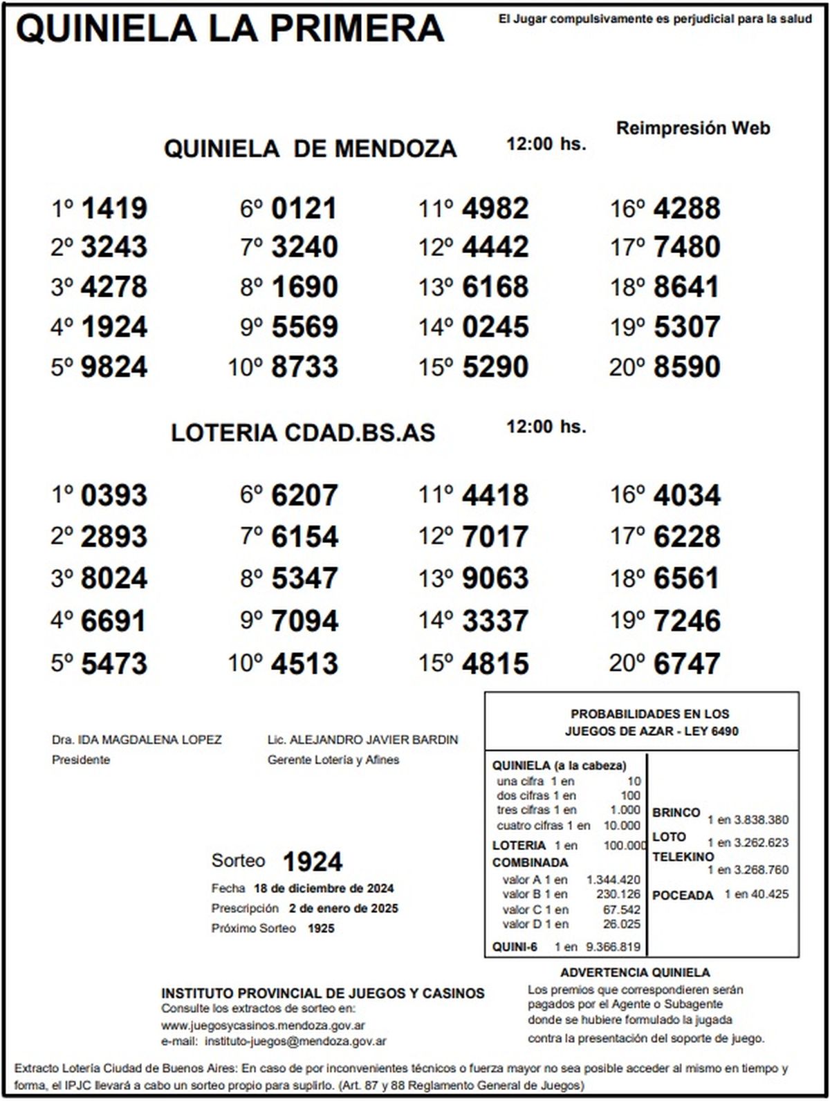 Resultados Quiniela de Mendoza: La Primera del 18 de diciembre de 2024