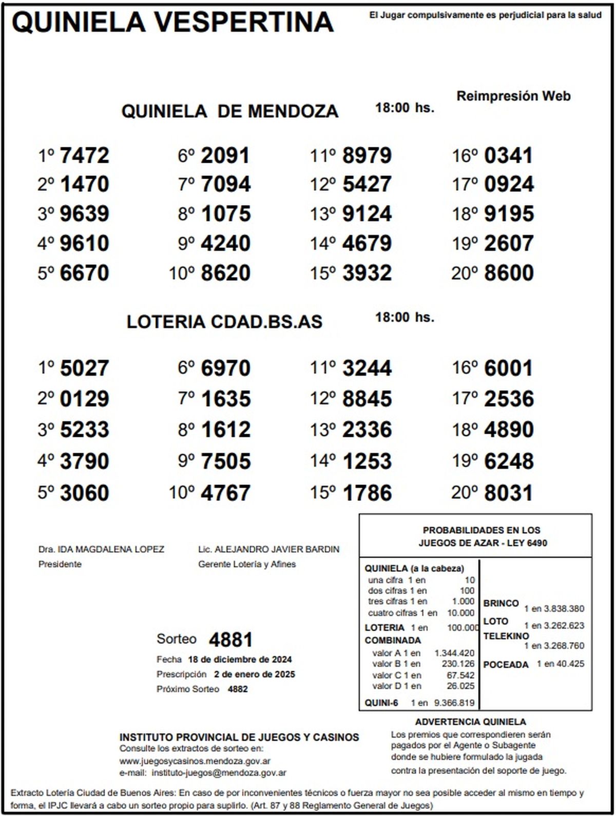 Resultados Quiniela de Mendoza: La Vespertina del 18 de diciembre de 2024