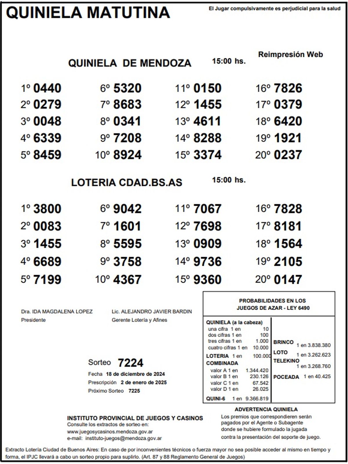 Resultados Quiniela de Mendoza: La Matutina del 18 de diciembre de 2024