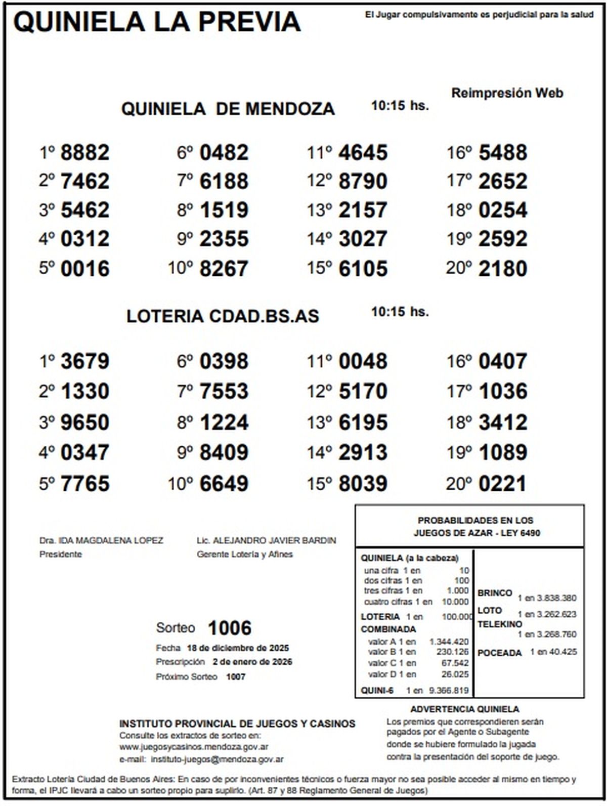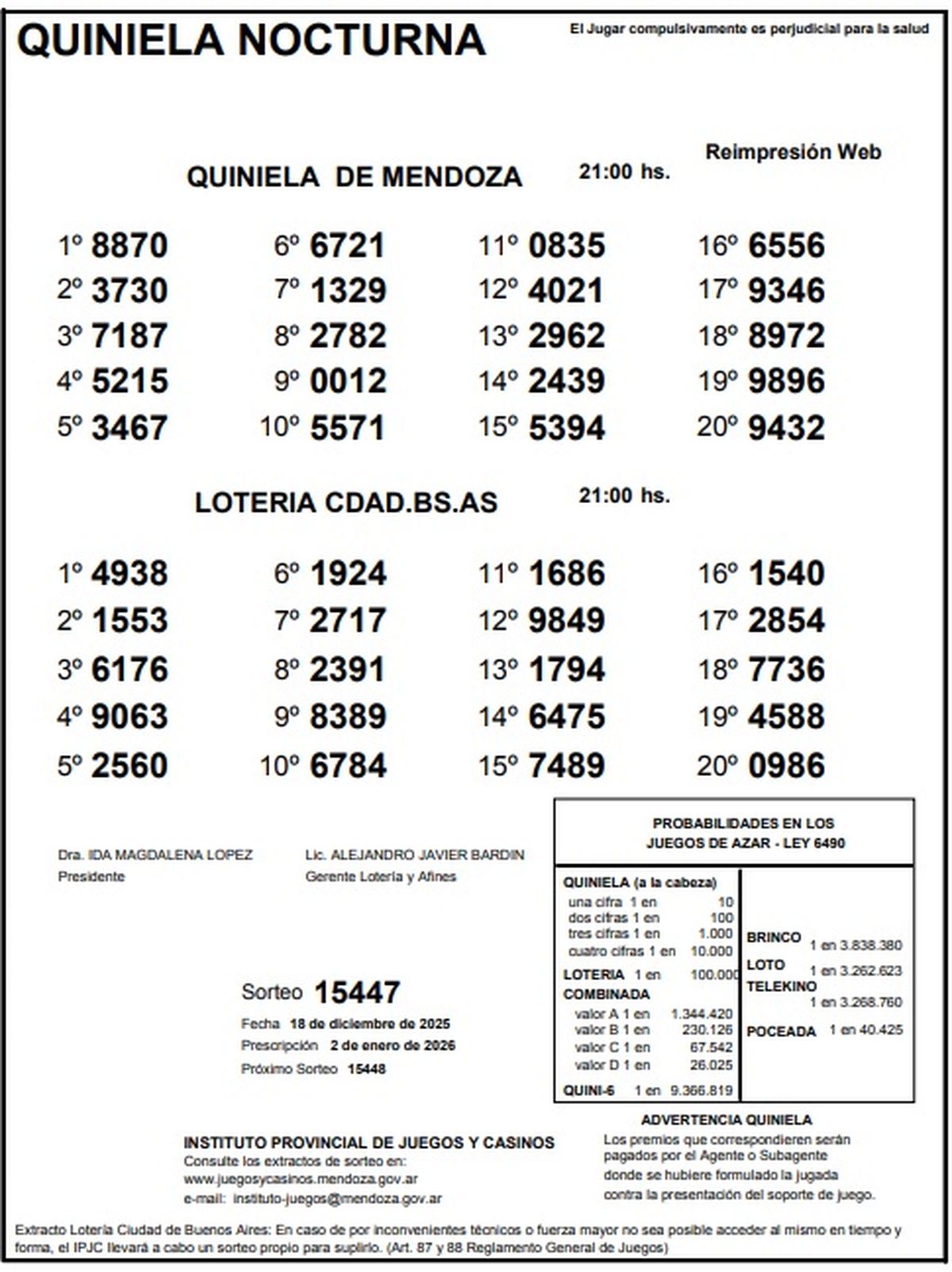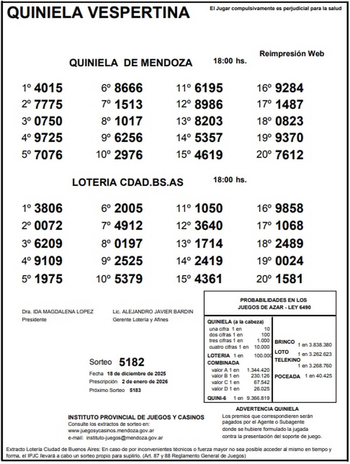 Quiniela de Mendoza: resultados de la Nocturna de hoy, 18 de diciembre de 2025