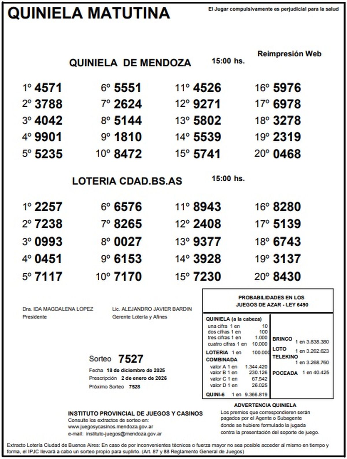 Resultados Quiniela de Mendoza: La Matutina del 18 de diciembre de 2025