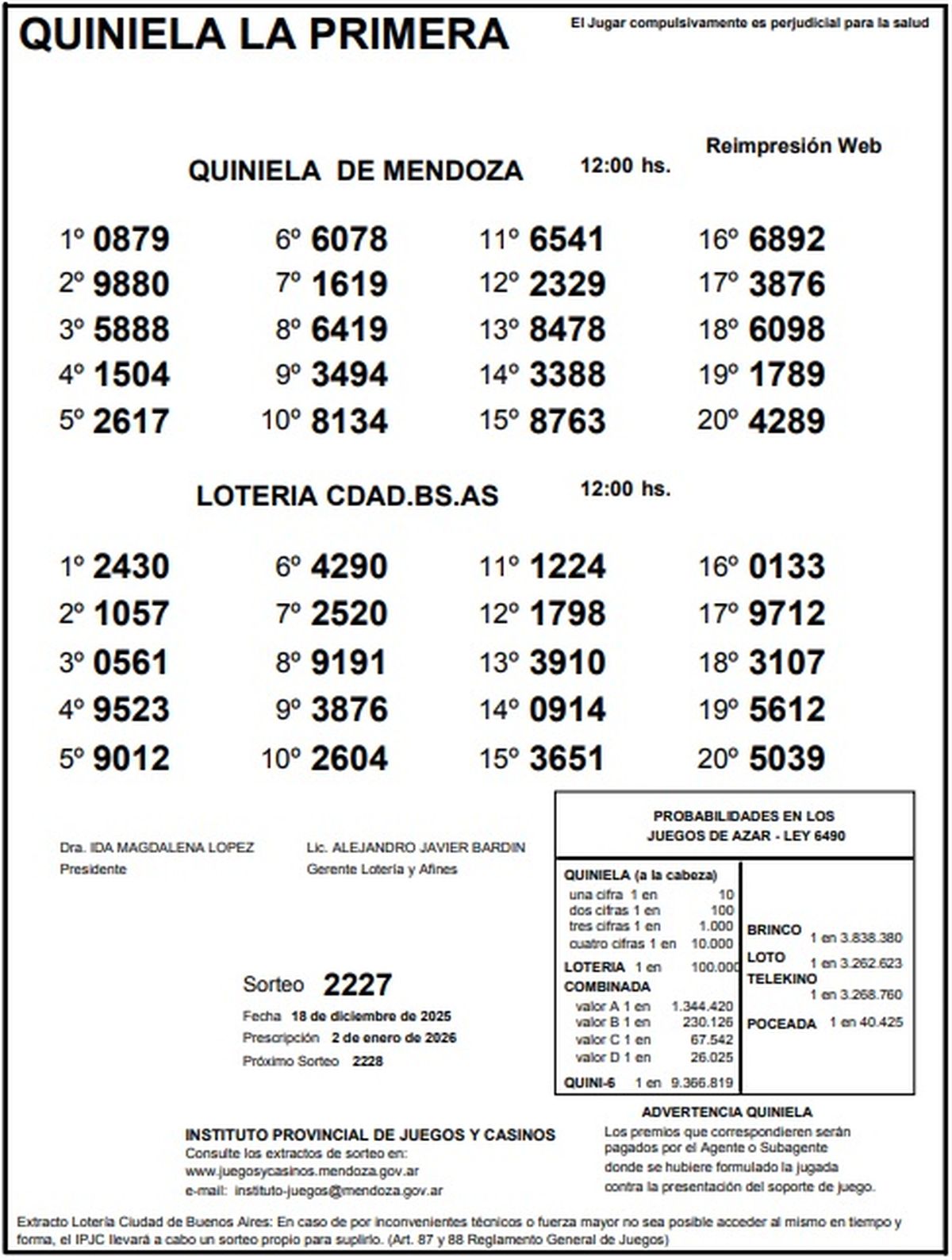 Resultados Quiniela de Mendoza: La Primera del 18 de diciembre de 2025