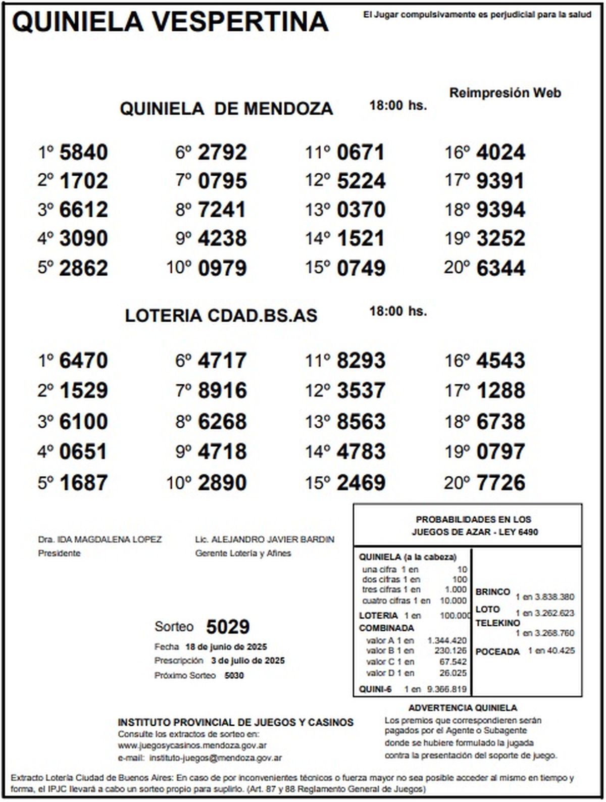 Resultados Quiniela de Mendoza: La Vespertina del 18 de junio de 2025
