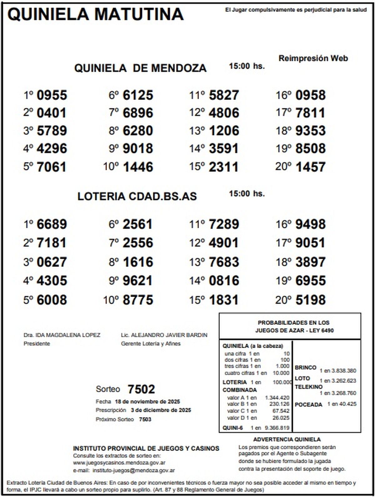 Resultados Quiniela de Mendoza: La Matutina del 18 de noviembre de 2025