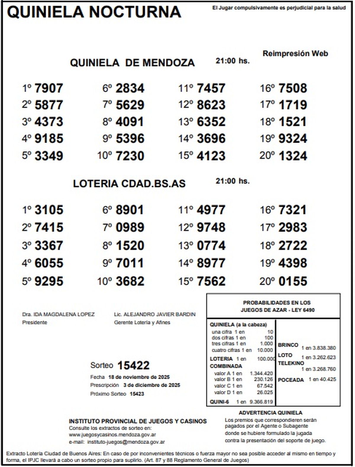 Quiniela de Mendoza: resultados de la Nocturna de hoy, 18 de noviembre de 2025