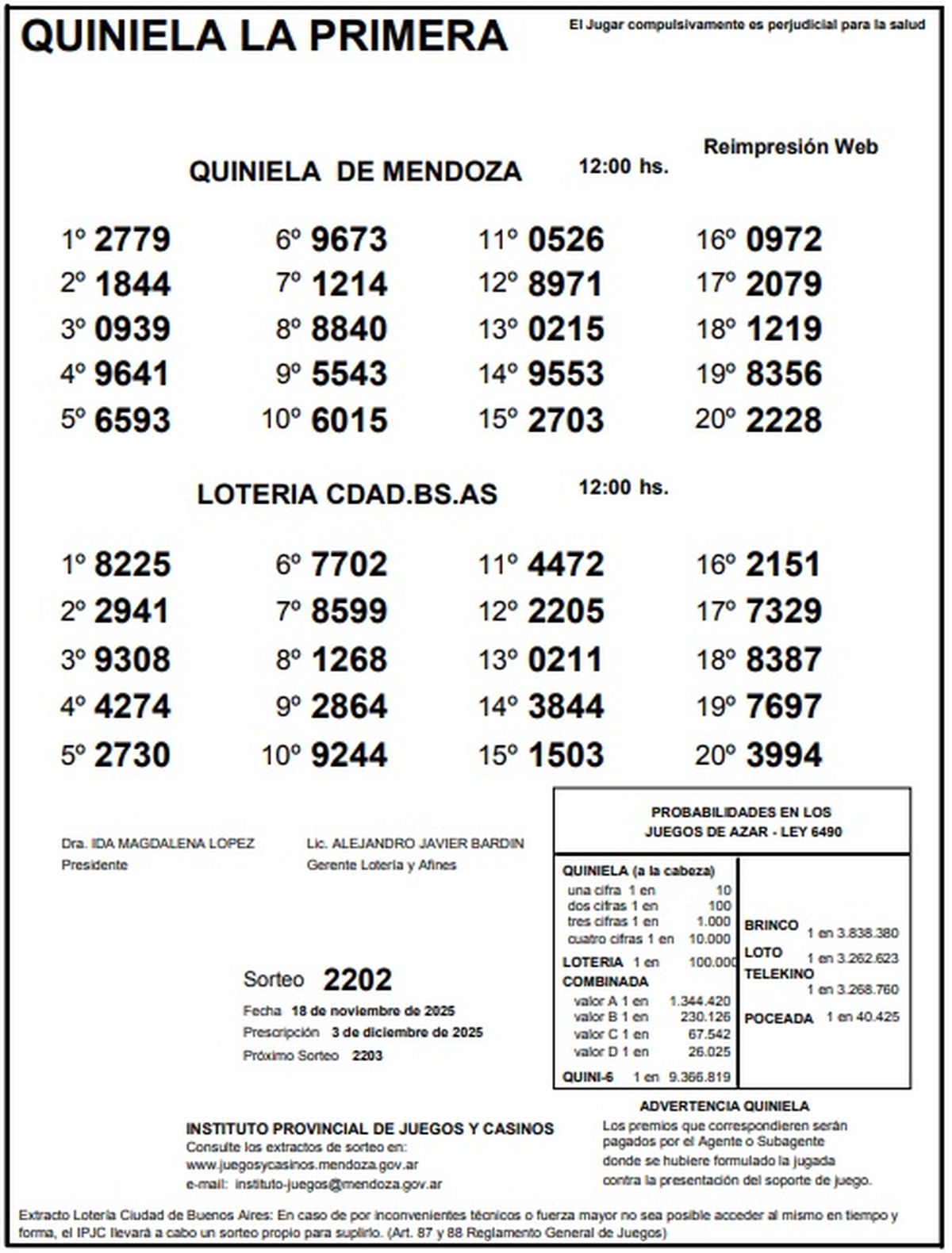 Resultados Quiniela de Mendoza: La Primera del 18 de noviembre de 2025