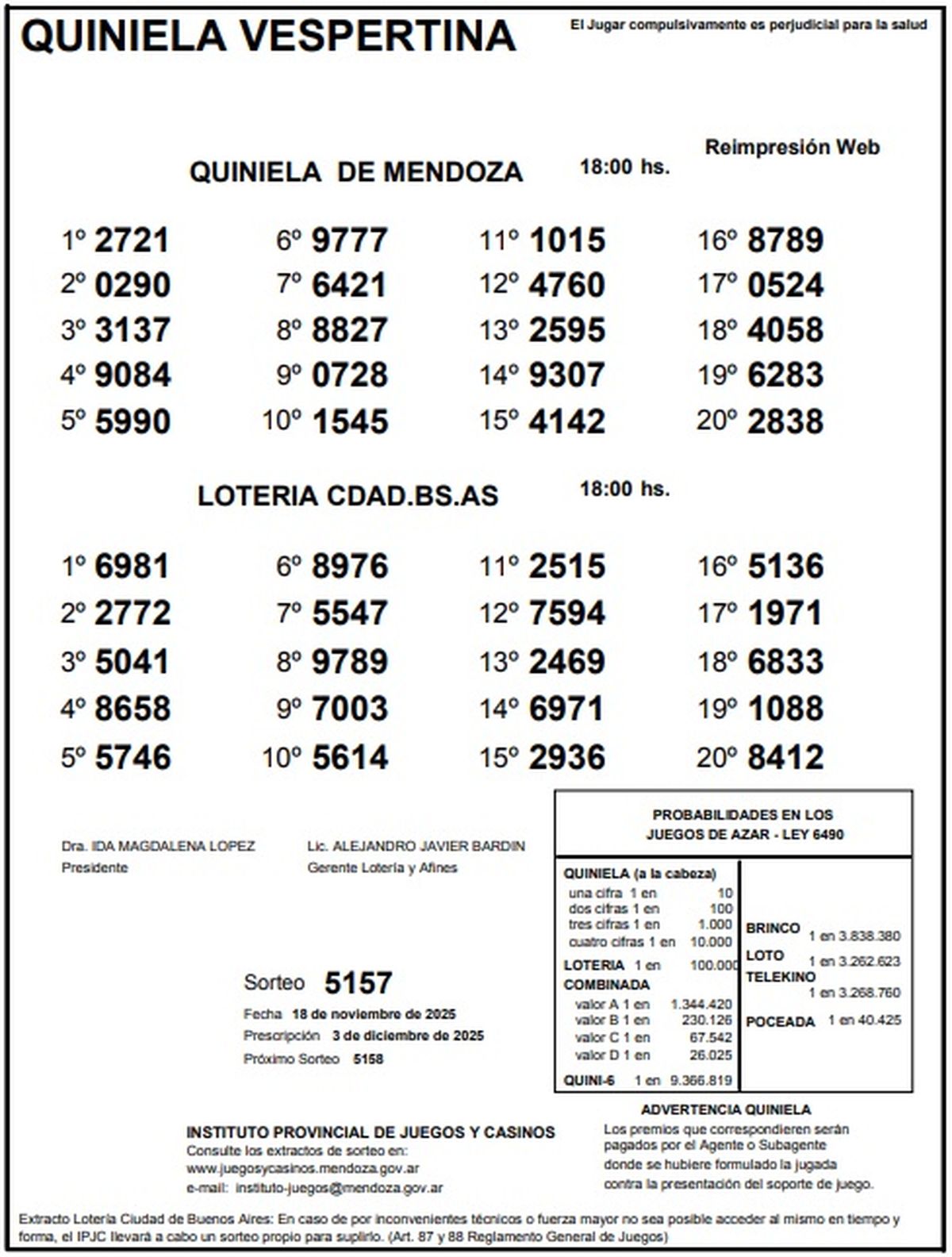Resultados Quiniela de Mendoza: La Vespertina del 18 de noviembre de 2025