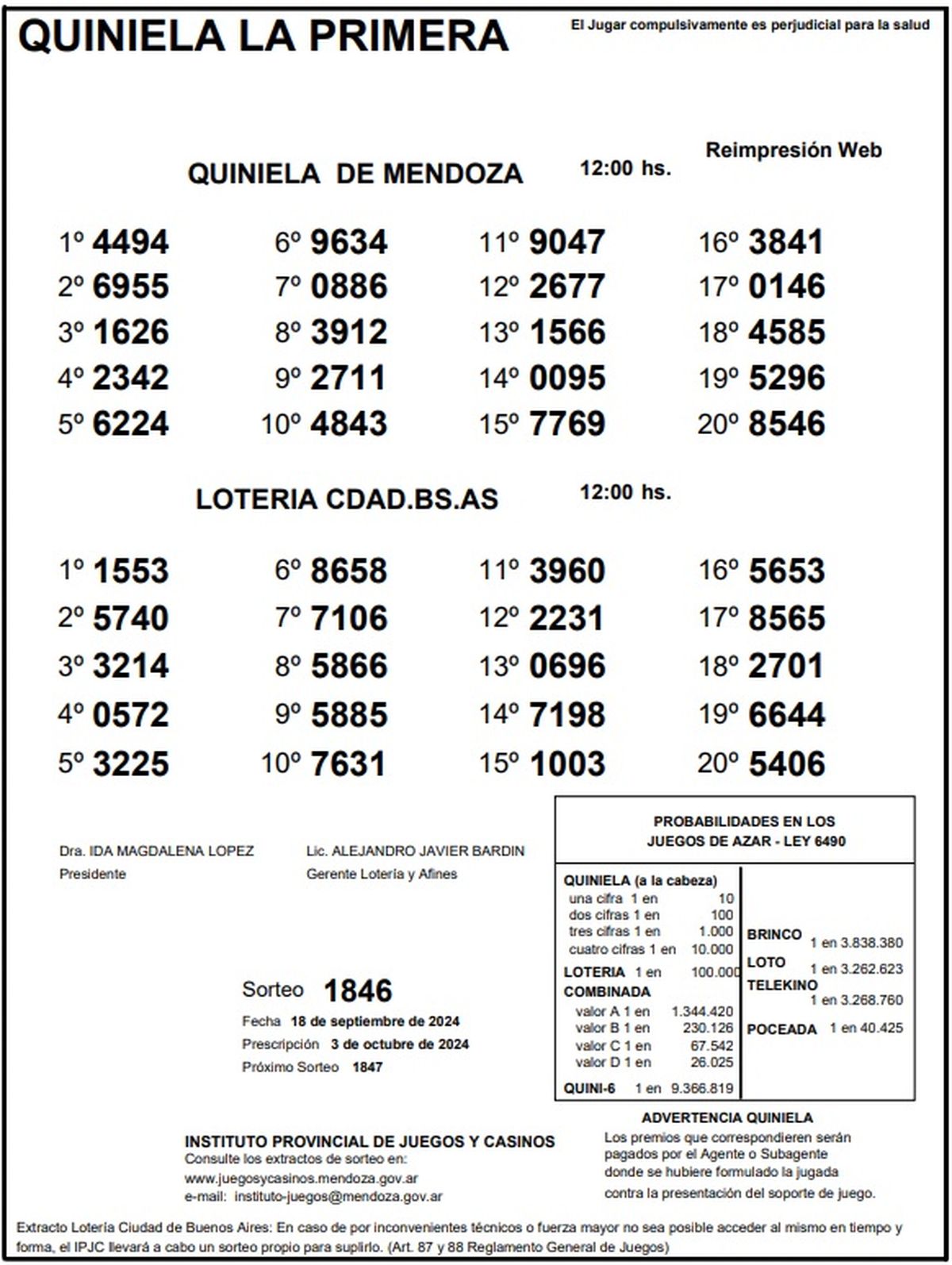 Resultados Quiniela de Mendoza: La Primera del 18 de septiembre 2024