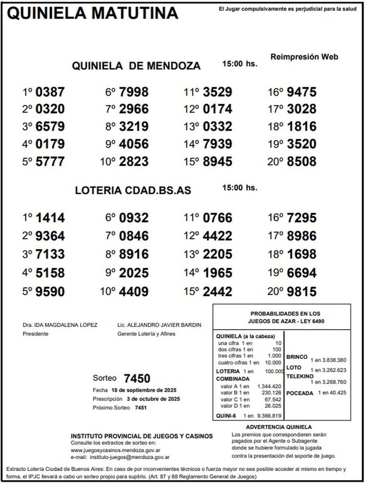 Resultados Quiniela de Mendoza: La Matutina del 18 de septiembre de 2025