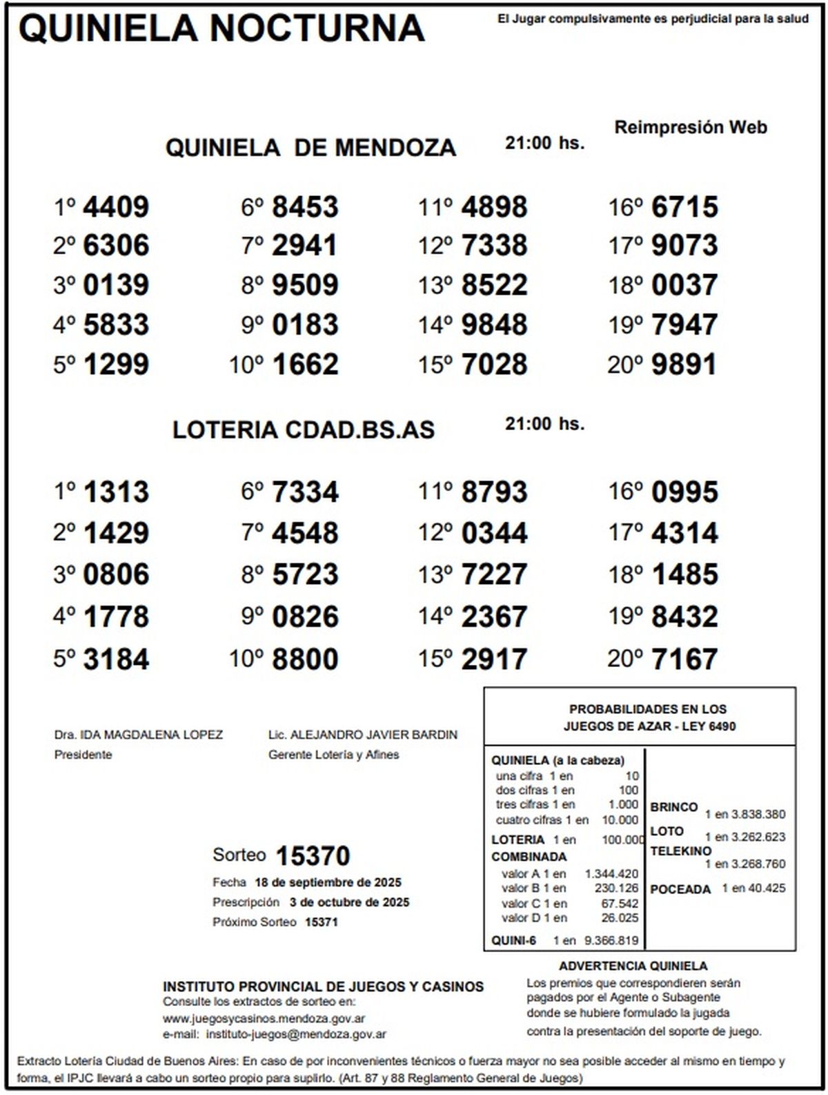 Quiniela de Mendoza: resultados de la Nocturna de hoy, 18 de septiembre de 2025