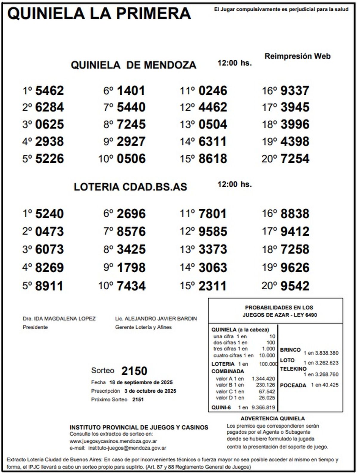 Resultados Quiniela de Mendoza: La Primera del 18 de septiembre de 2025