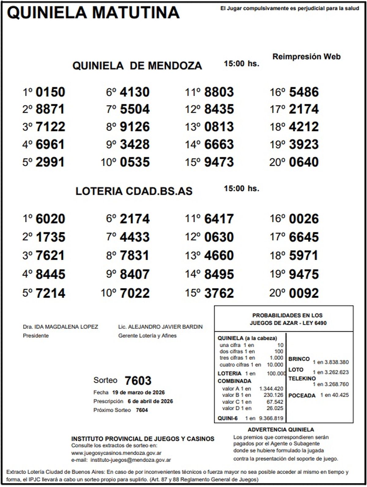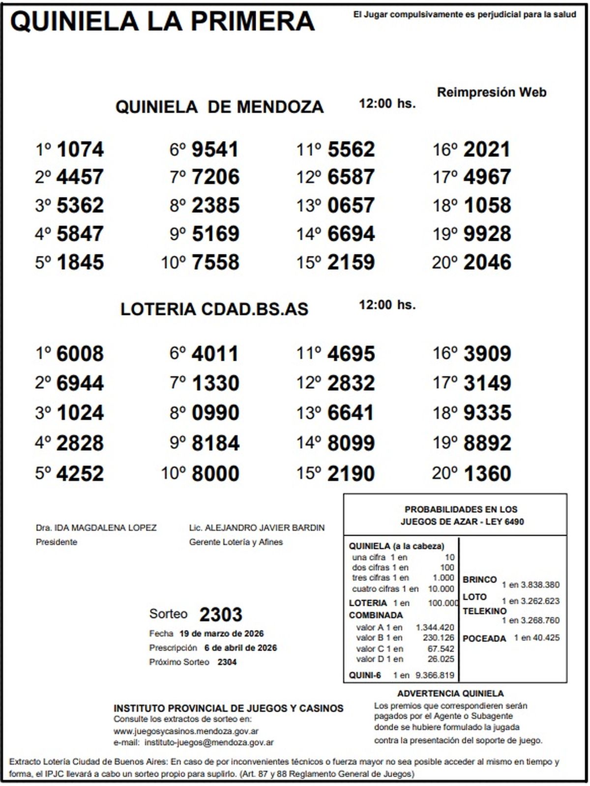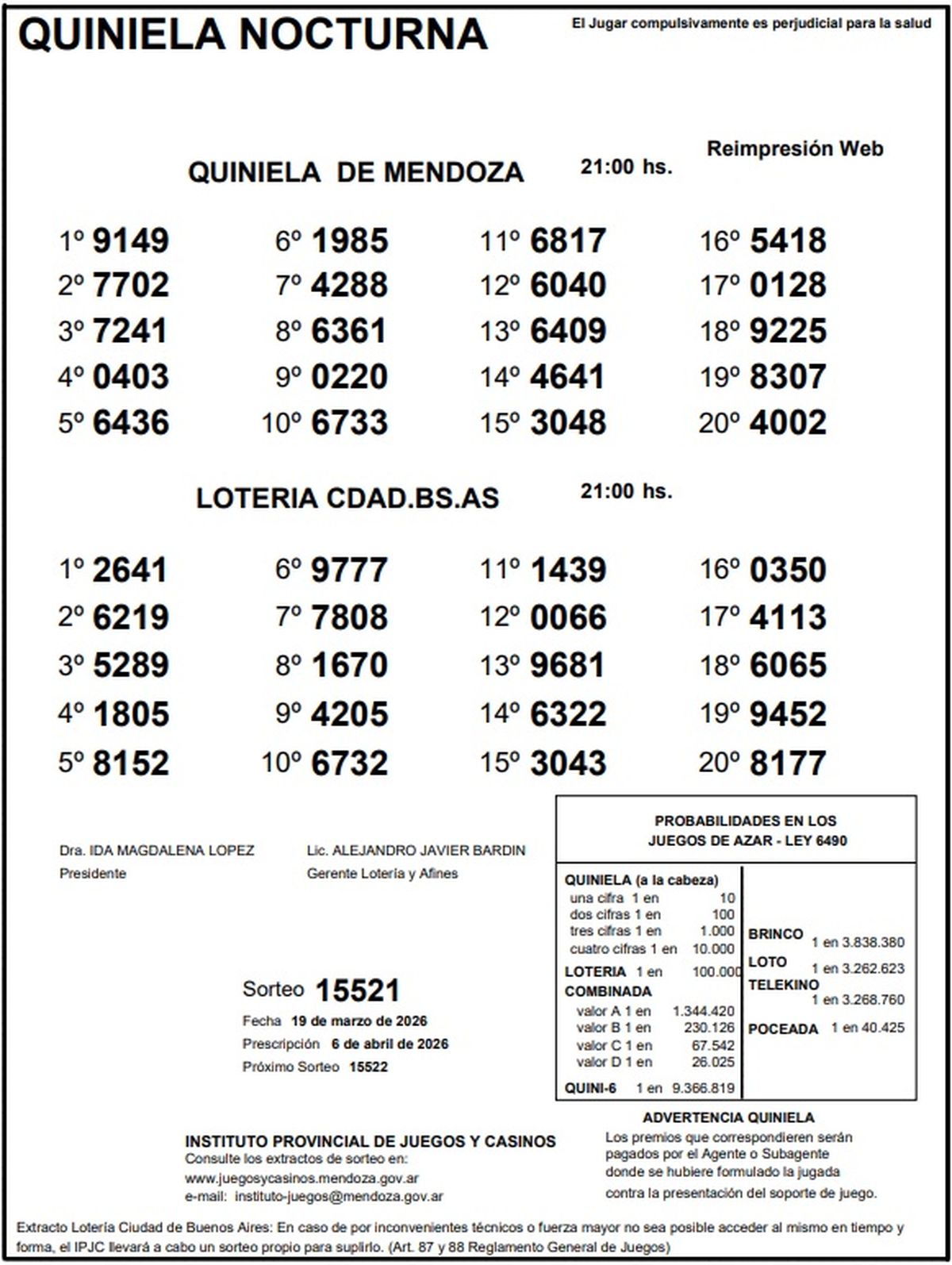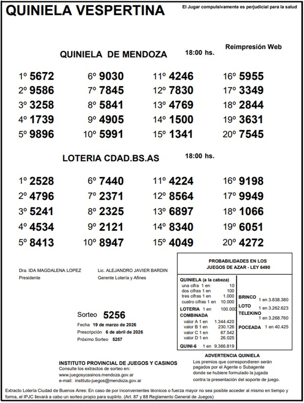 Quiniela de Mendoza: resultados de la Nocturna de hoy, 19 de marzo de 2026