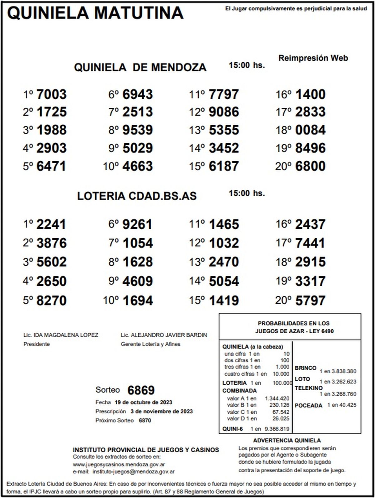 Resultados Quiniela de Mendoza: La Matutina del 19 de octubre 2023