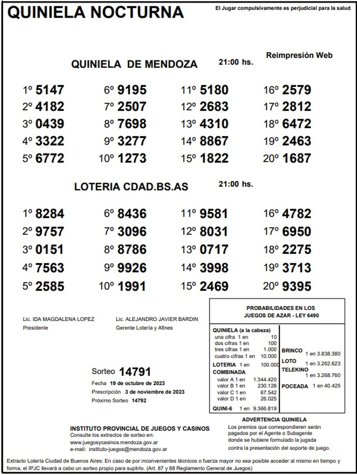 Quiniela de Mendoza: resultados de la Nocturna de hoy, 19 de octubre de 2023