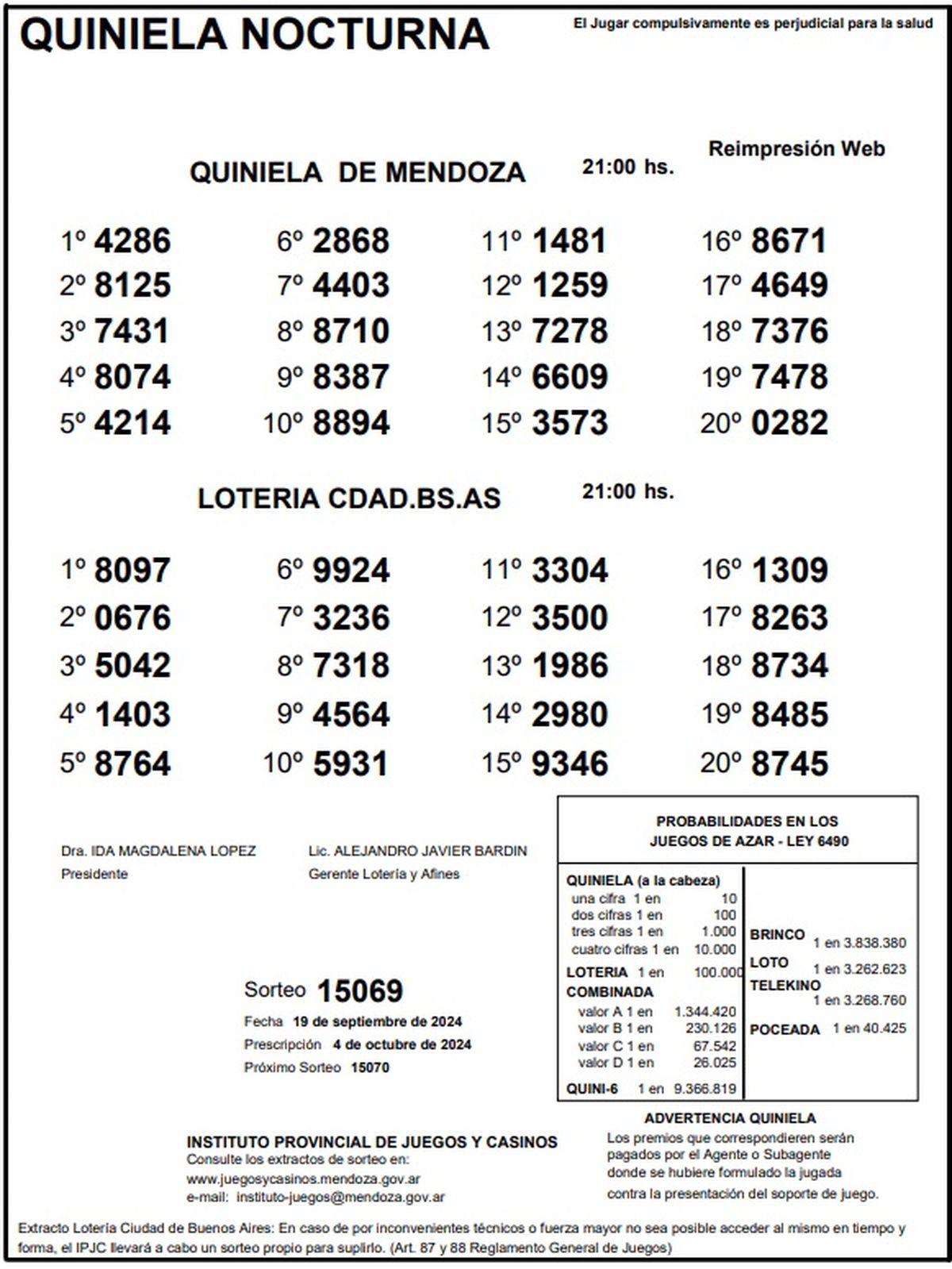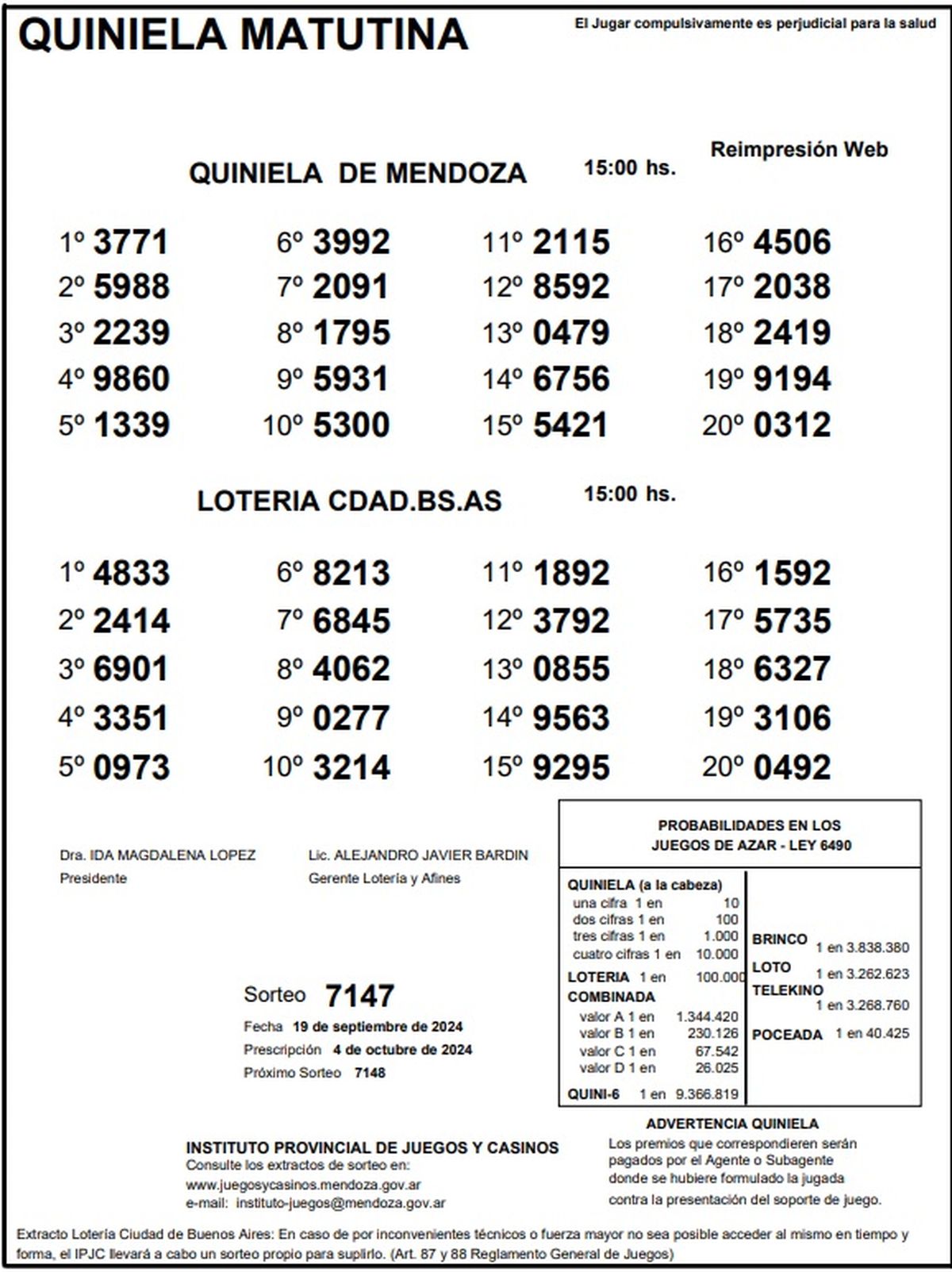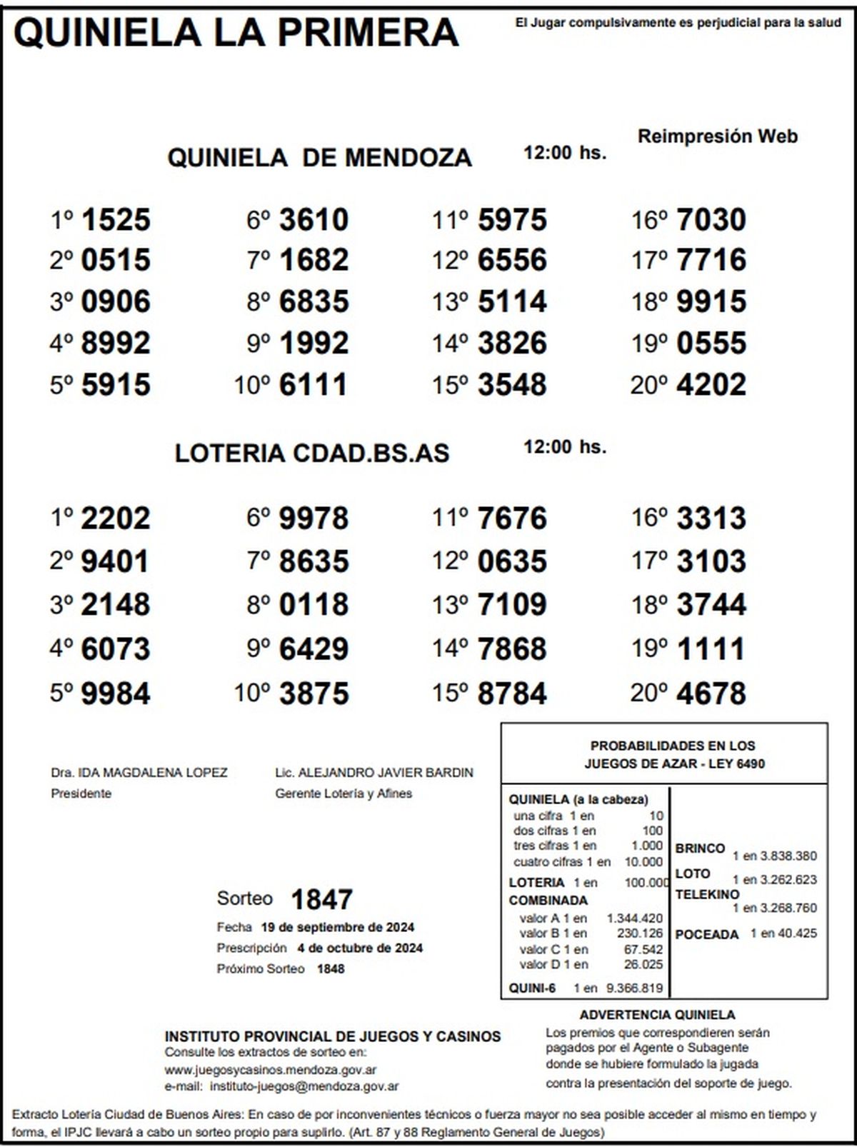 Resultados Quiniela de Mendoza: La Primera del 19 de septiembre 2024